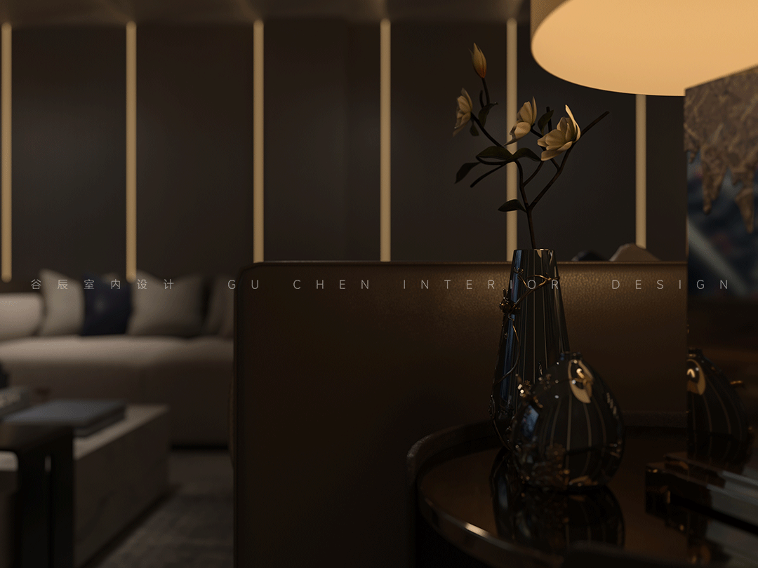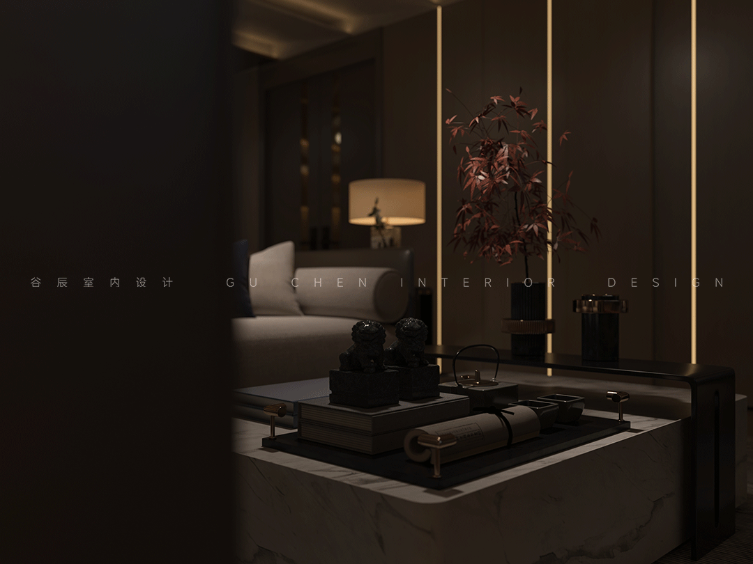 茶几上摆放典藏书籍与黑色水晶雕刻的狮子,与绯红色插花瓶一同衍生出庄重祥和的气势,既有现代主义的精神,又融合了东方文化的风味,让人惊叹于其独特的美学价值。