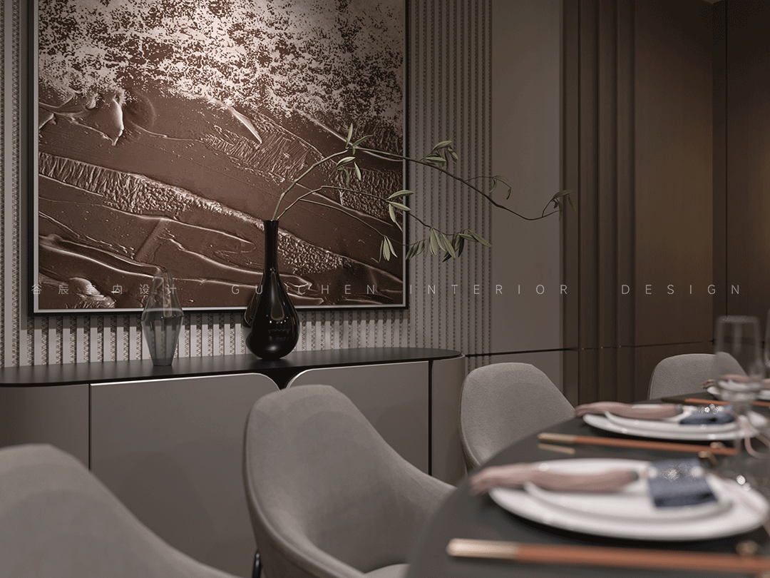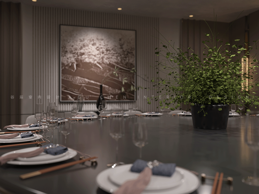 会客厅整体大方得体,配套的磨砂大理石餐桌温润雅致,空间更显东方神韵。