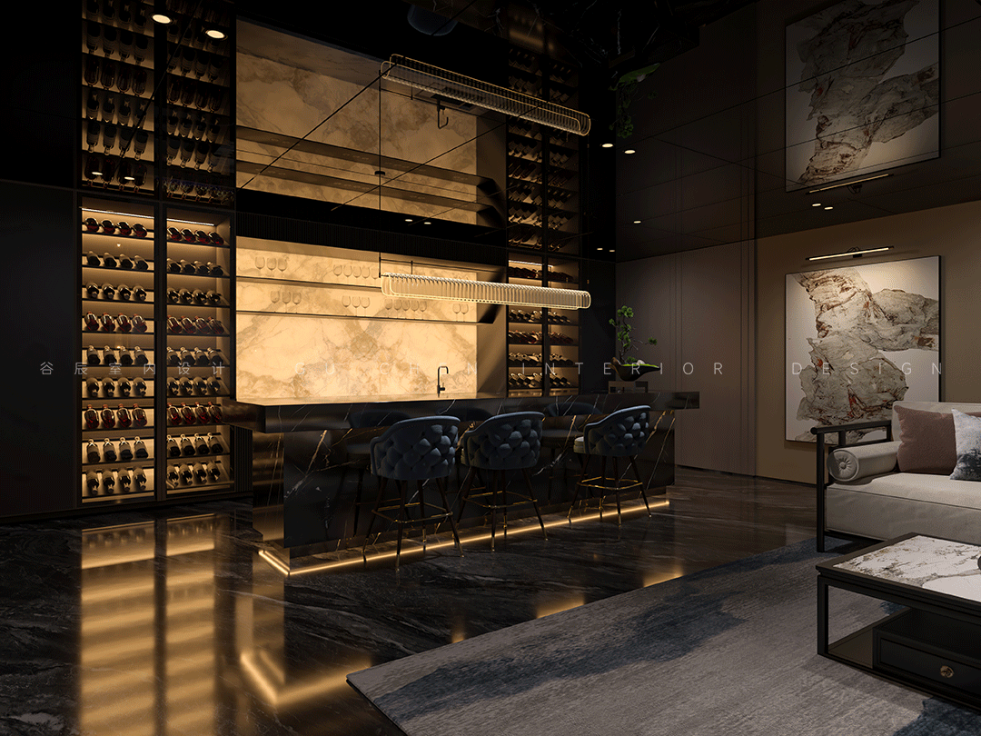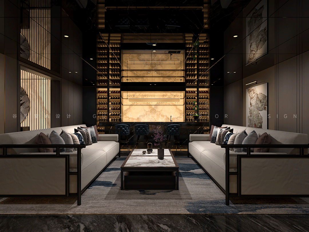 会客厅大体分为品酒区和沙发区域,品酒区的吧台两侧,为藏酒展示区,无视线遮挡,屋主的财力直观可见,背景墙延续端景的设计。