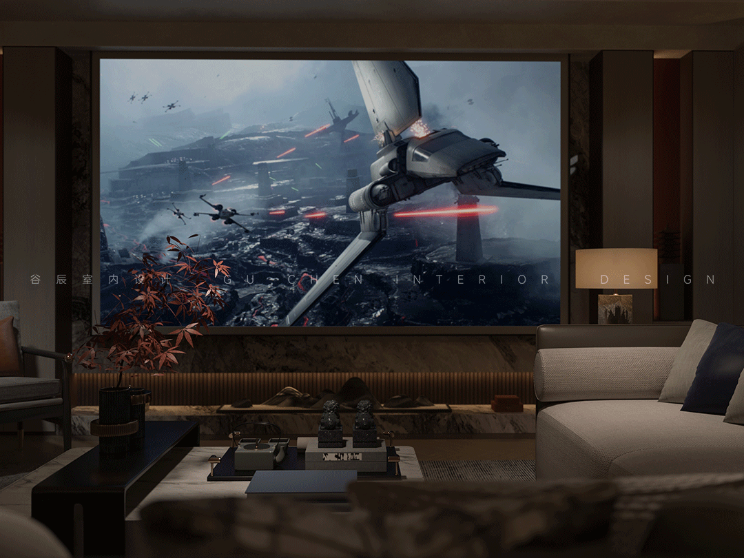 高清幕布、超宽铝合金边框架,超强双层双连接拐角,超平整幕布,4K高清观影体验,满足业主外形豪华美观大方的需求。
