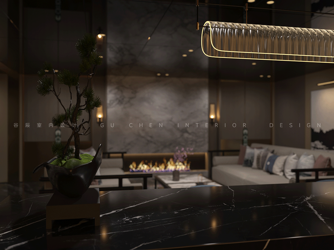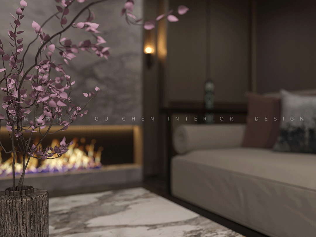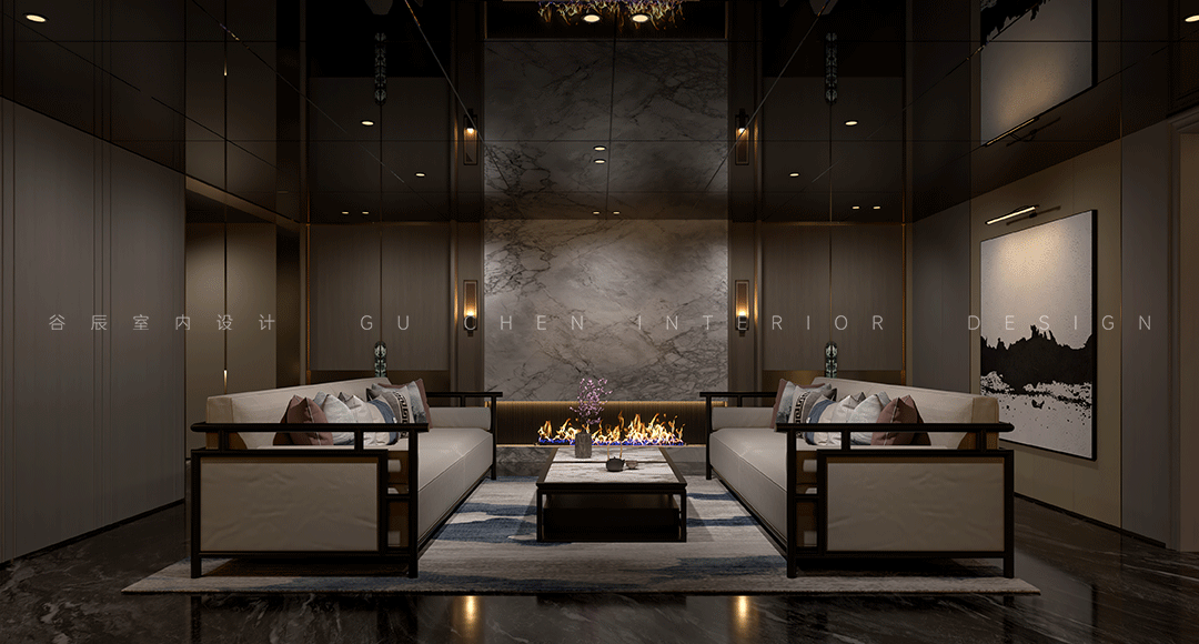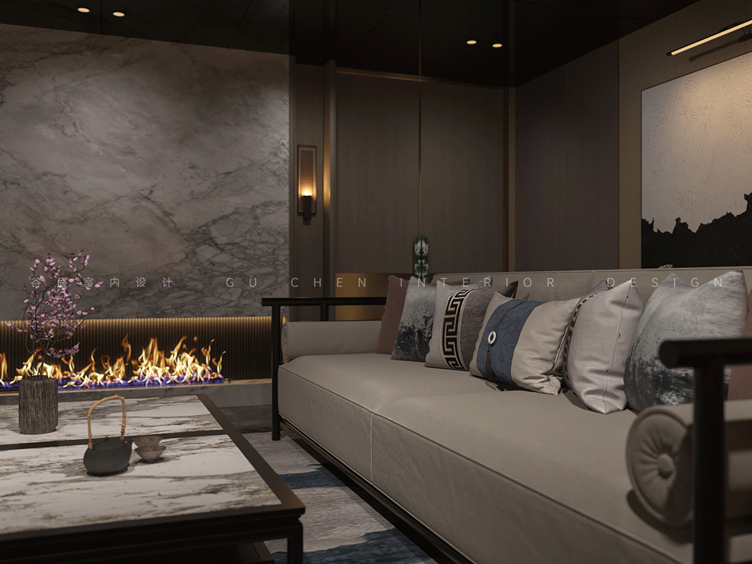 休闲大厅侧面安装壁灯下,壁炉里火苗跳跃着,整体既有现代简约时尚,又有中式的沉稳大气。
