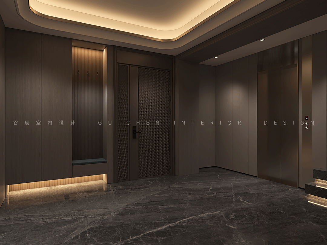 负二楼出行配备电梯,同时门的设计依然为隐门,材质和色彩纹理与整体保持一致,哑光质感,减少了金属的现代感。