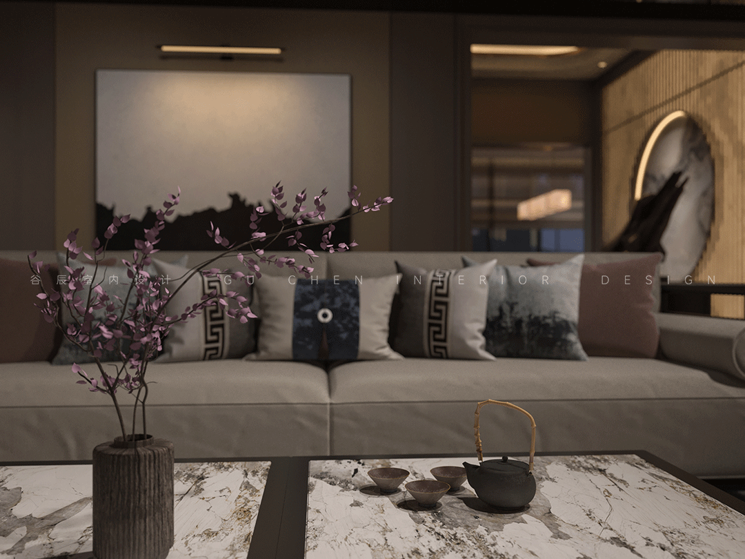 茶几上摆放着精致的茶具,桌面也是一贯的水墨纹理大理石,与经典中式元素抱枕一起完美呈现了中式的意境美。