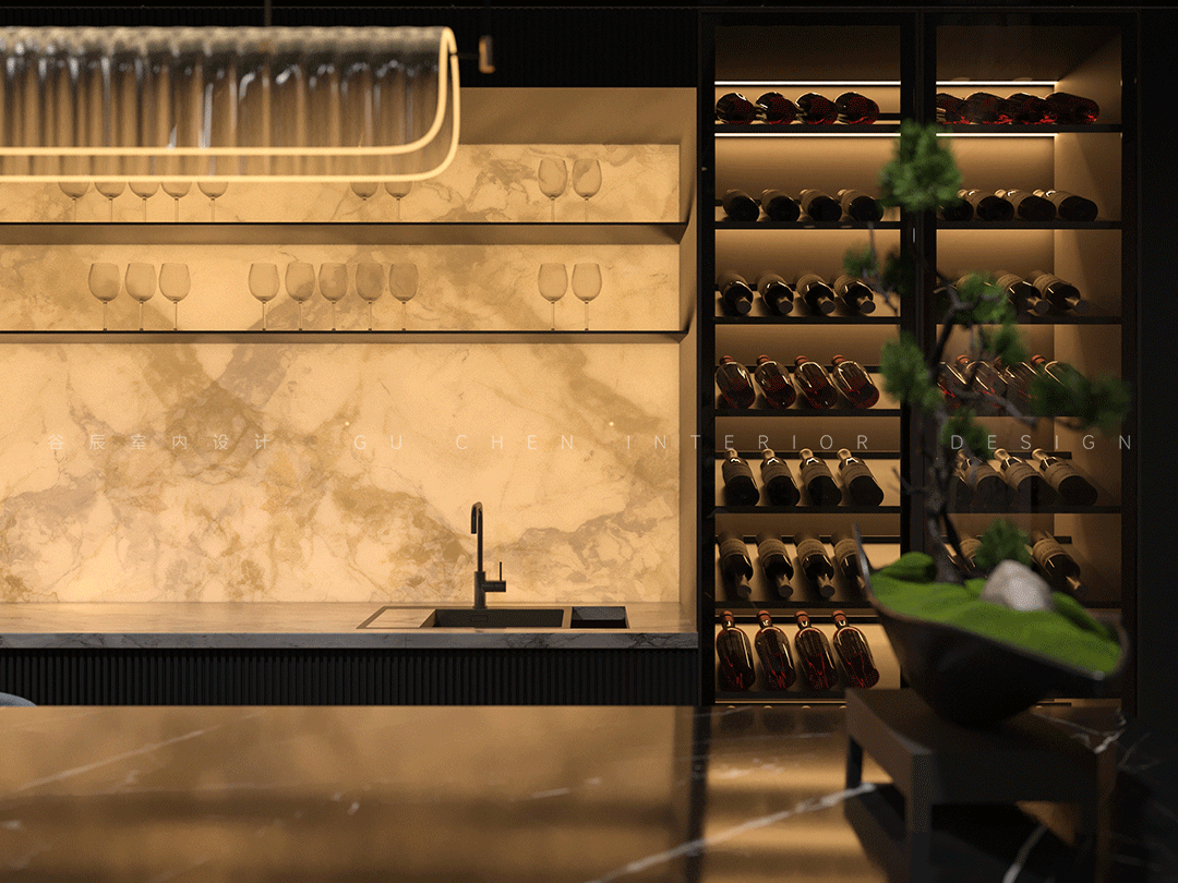 品酒区玻璃陈列架上为各式的珍贵名酒,和高级杯具,下方台面上依次摆放着制冰机与称重器,水槽,功能齐全,背景墙为水墨纹理的大理石,与竹叶盆景的摆件串起来,营造出独特的中式情境。