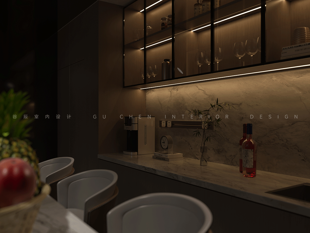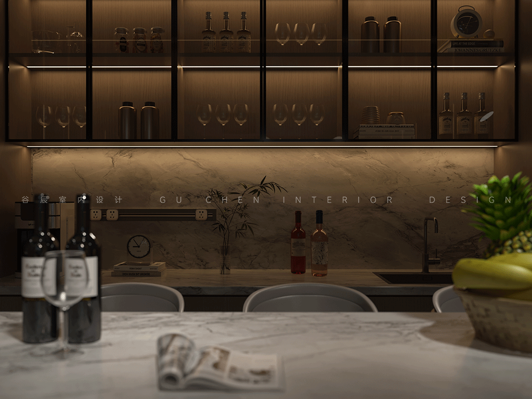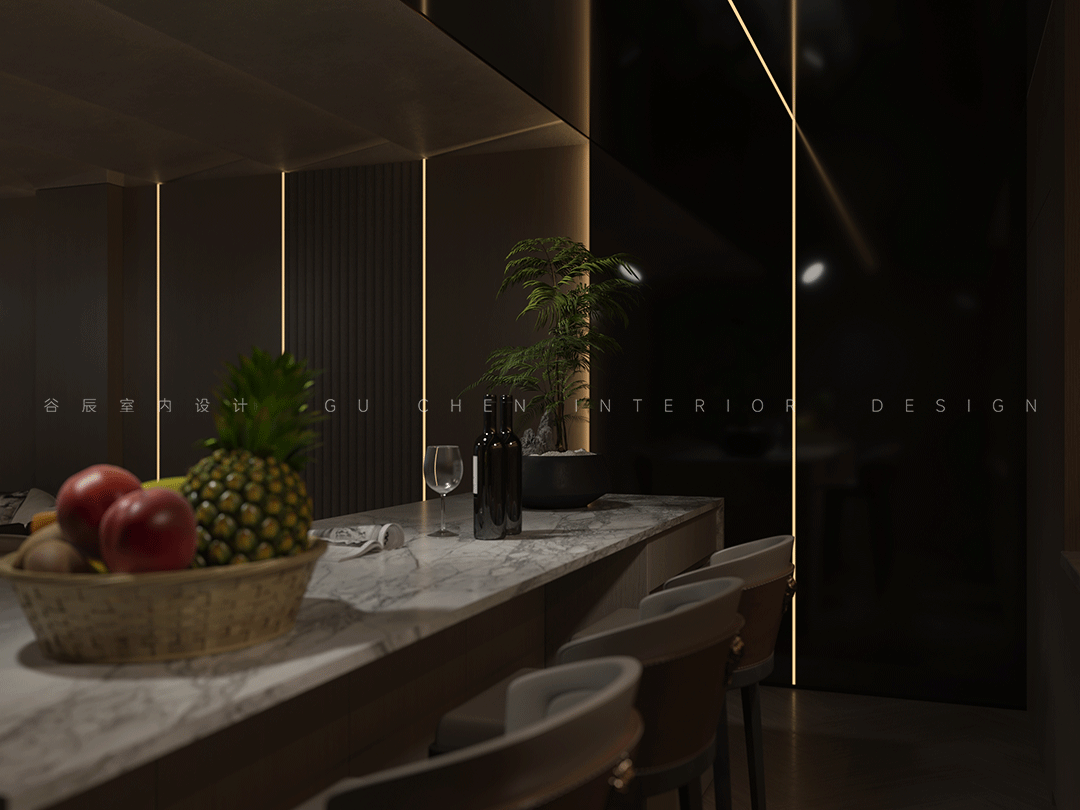 吧台上鎏金工艺的果盘中是应季的新鲜水果,包含了屋主招待客人的用心与诚意。