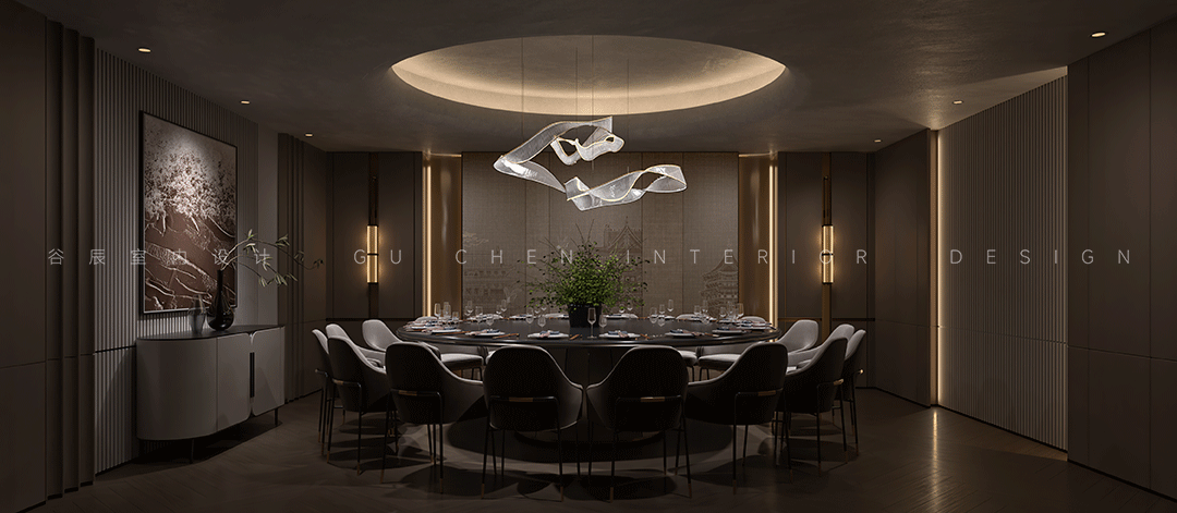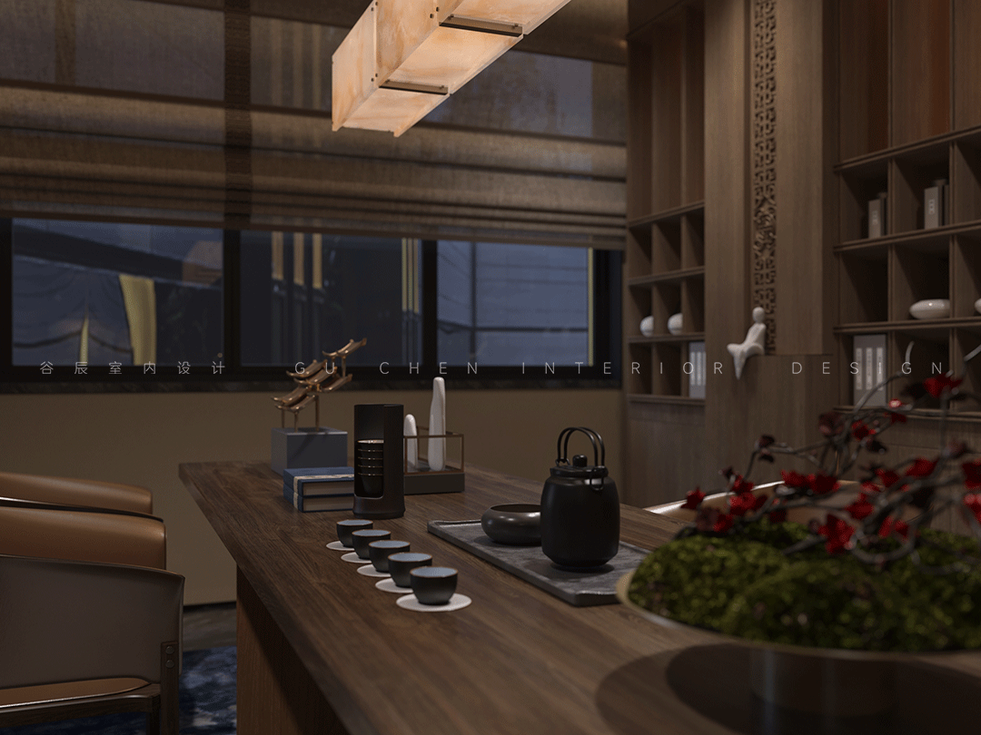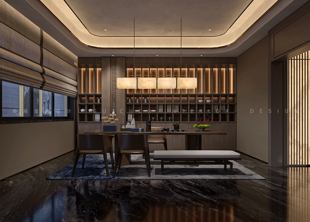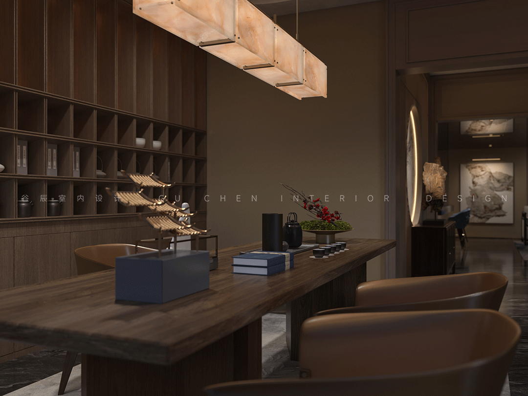 茶室正中间大气的灯龛悬浮吊顶下,摆放檀木茶桌,木椅与长条矮凳呈围合姿态,打造宾客间专注亲切的品茗氛围。