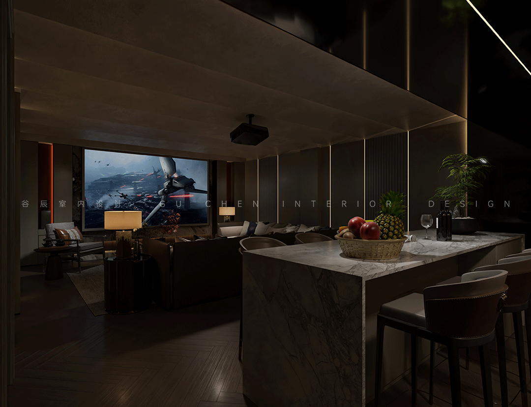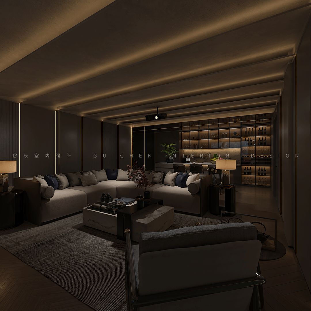 影音室大体分为观影区和品酒区,大横厅设计让空间更显大气宽阔,无主灯照明保证光线不影响观影体验,天花板波纹立体设计,褶皱内侧安装灯管,美观简洁。