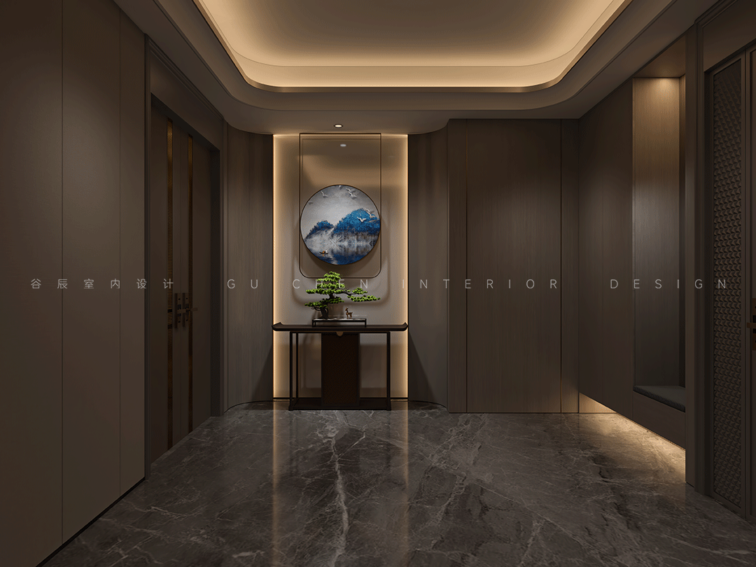 正门端景面积小但富有景致,长方形壁龛用黑色金属画框悬挂蓝色刺绣山水画,下方古朴木桌上摆放诗意的古树摆件,充满诗意和故事情节的元素融于空间内,有一种穿越古代的体验感。