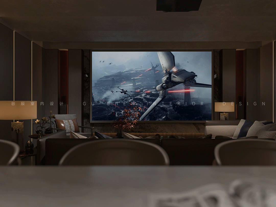 2. 茶室和影音室秉承大空间、多座椅的原则,用新中式元素为屋主搭建了高级而沉稳的两大娱乐空间