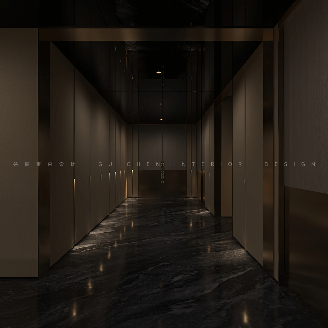 走廊为无主灯设计,两侧墙面缝隙中安装小型感应照明灯,点点星光,犹如夜里的烛火,映在高级的地板上,照亮着前来赴会客人的脚步。