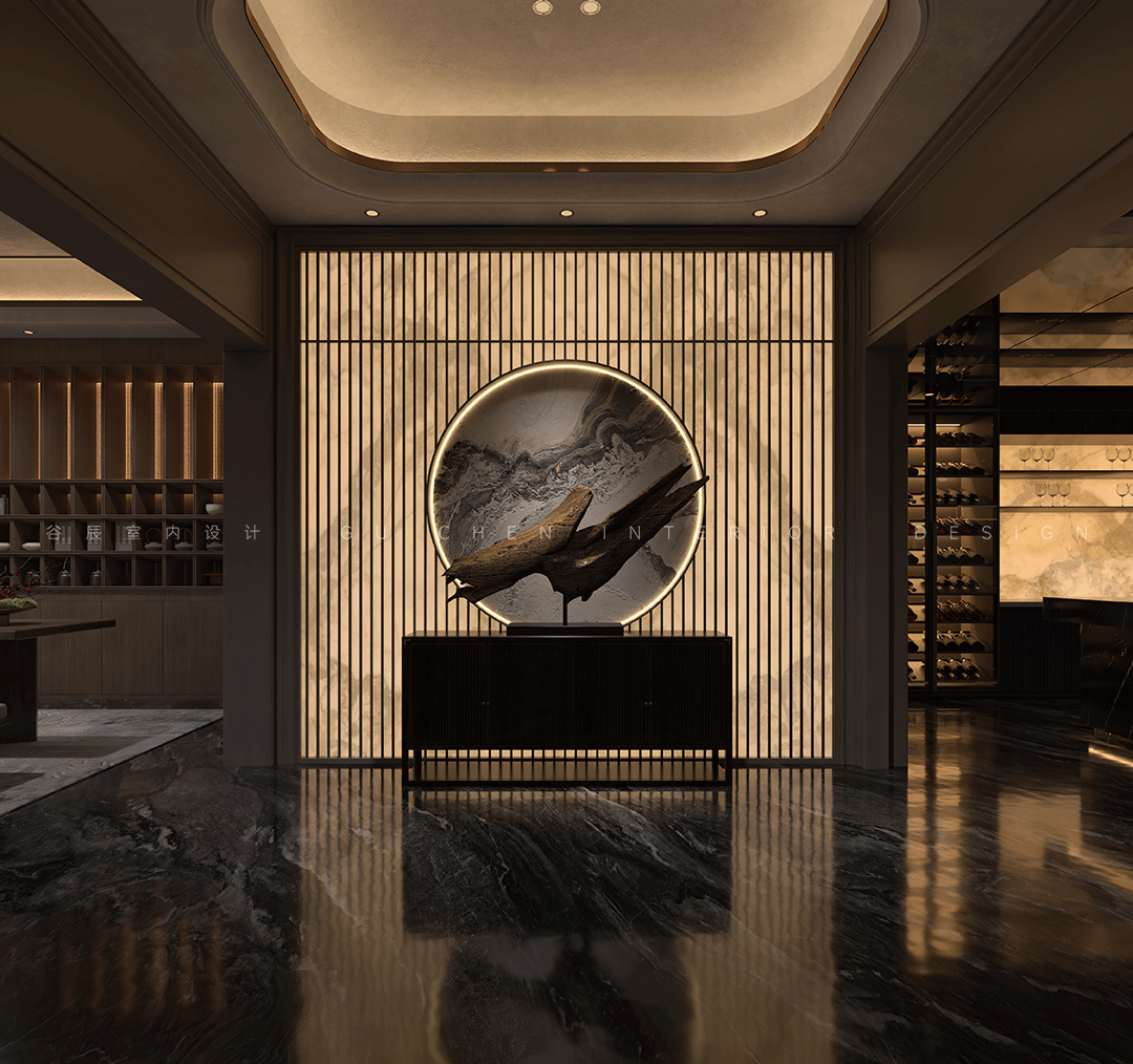 进入会客厅,首先映入眼帘的是极具中式禅意色彩的端景,大型光幕墙上隐约现出水墨纹理,暗含“迎水山”的来财之意,中间镶嵌圆形壁画,画的笔触豪迈而张扬,与前景柜台上的飞天奇石搭配,倒映在透亮的大理石地板上,成为一处宛如水中的景致。