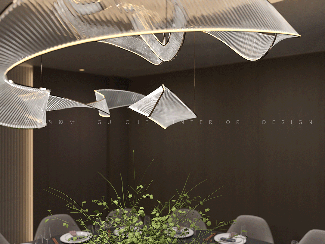挑高圆形吊顶边缘镶嵌照明光圈,悬吊抽象的玻璃艺术装饰,与下方的绿色盆景一起,折射出灵动的光线。