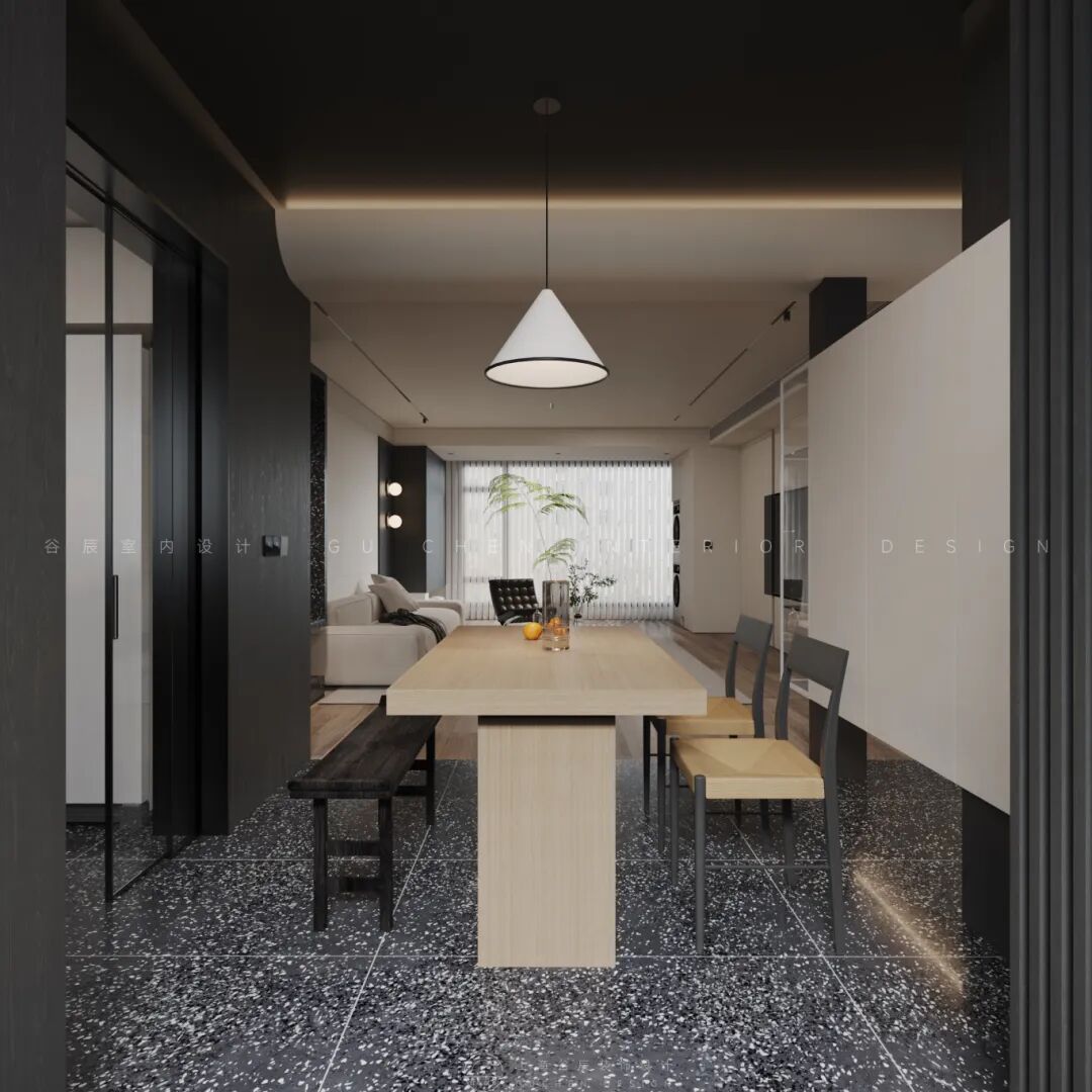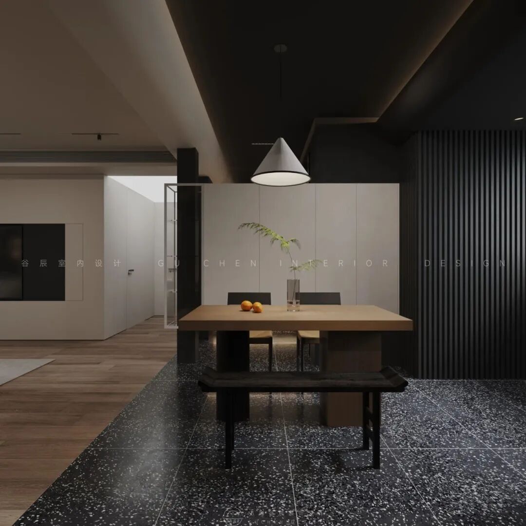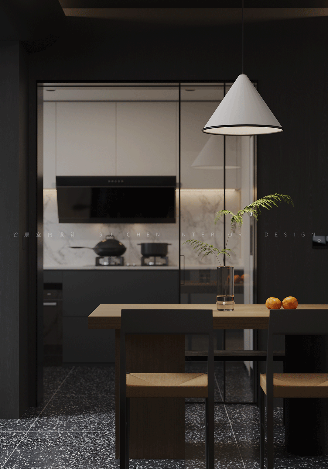 在黑白设计中,原木色融入其中,令整个空间色调更为鲜明。简约白色吊灯为黑夜点亮,与星空对话,打造出个性而富有浪漫色彩的用餐氛围。