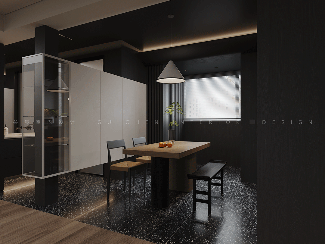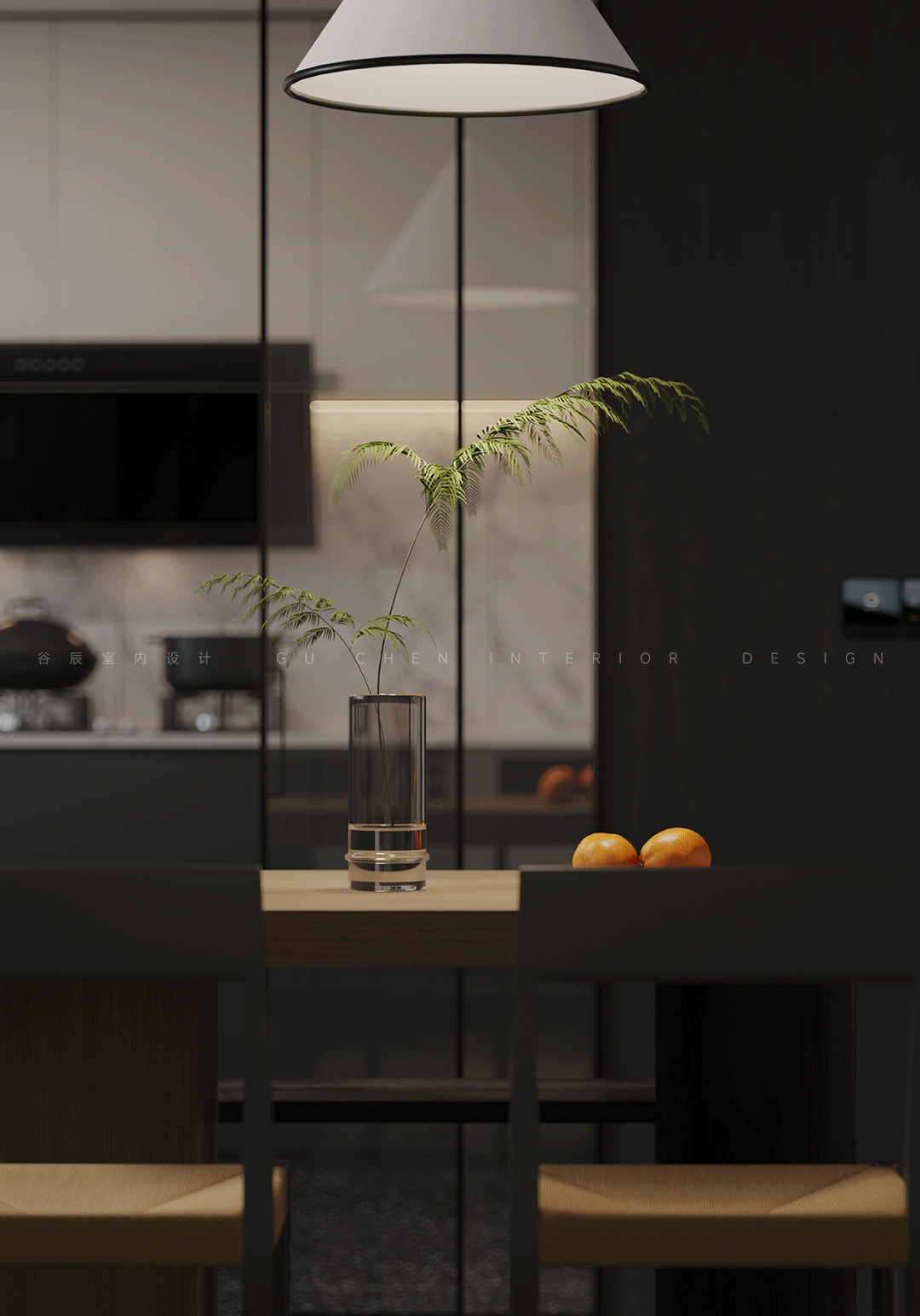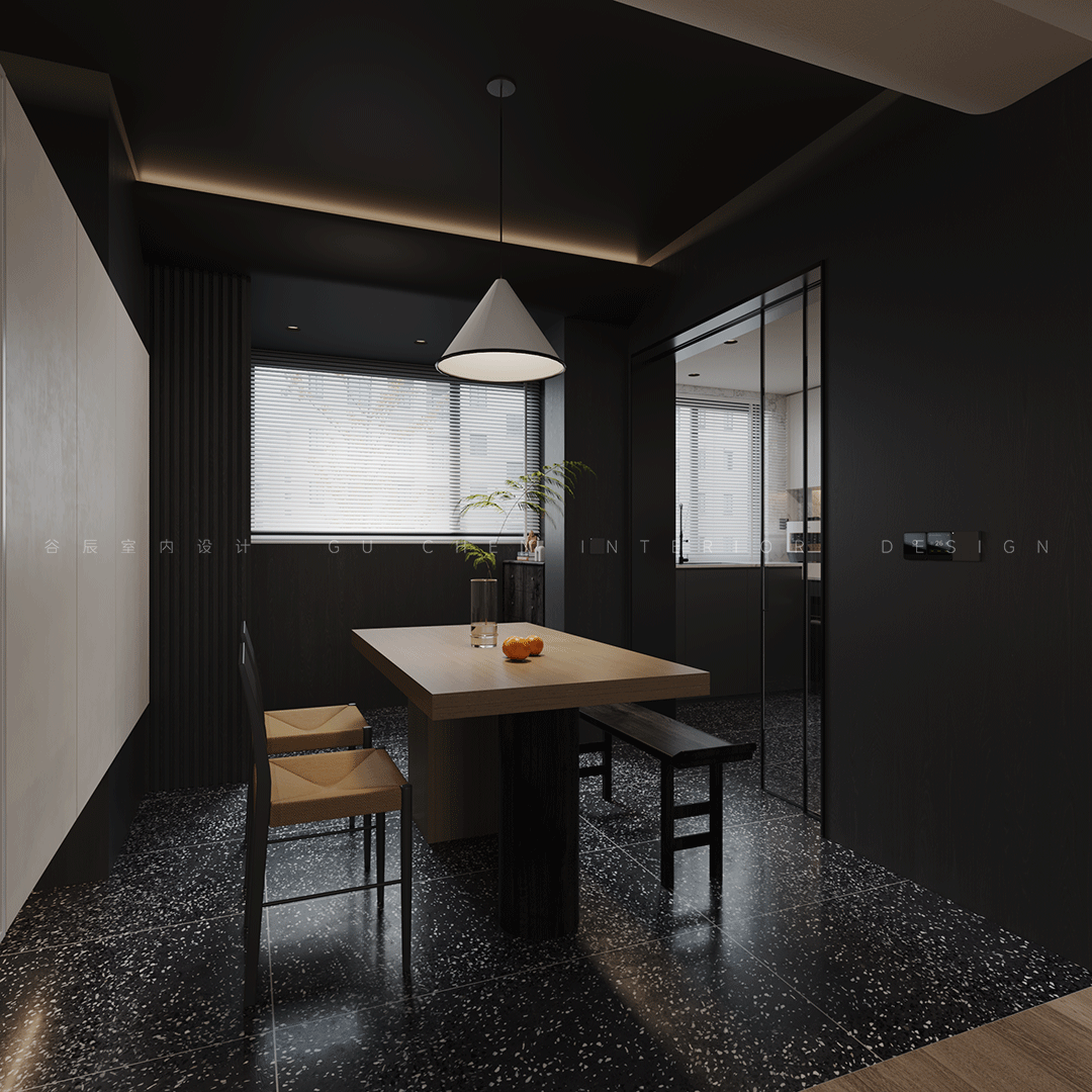 在黑白设计中,原木色融入其中,令整个空间色调更为鲜明。简约白色吊灯为黑夜点亮,与星空对话,打造出个性而富有浪漫色彩的用餐氛围。