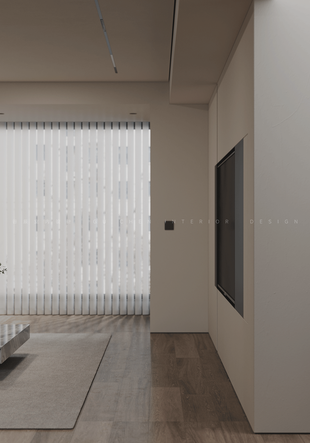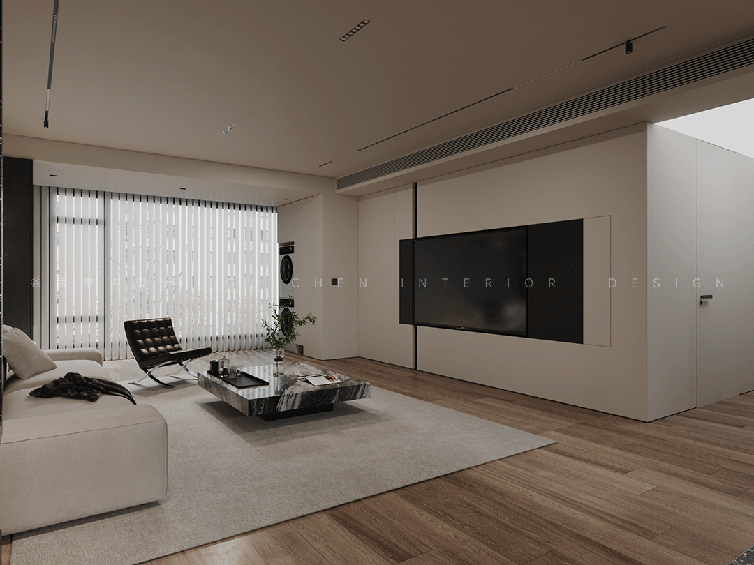 电视背景墙上的隐形门别出心裁,巧妙设计既呵护主卧私密,又注入空间神秘色彩,完美捕捉功能设计的细腻之处。
