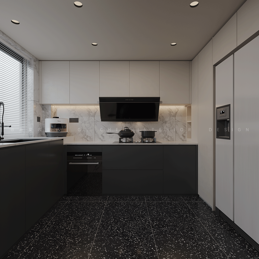 纯净的黑白色系呈现出宽敞明亮之感,仿佛被一层干净整洁的滤镜包裹。高低错落的柜体,赋予空间独特的层次美感,由细节处打造烹饪舒适感。