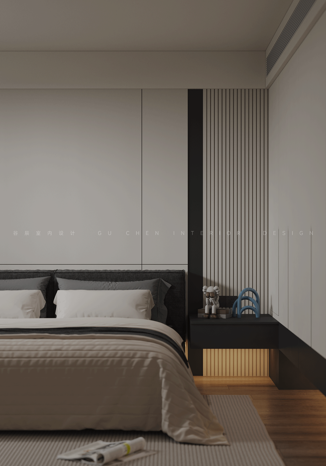 右侧床头柜巧妙地采用悬浮设计,搭配柔和的氛围灯,为空间增添了一份温暖的韵味。
