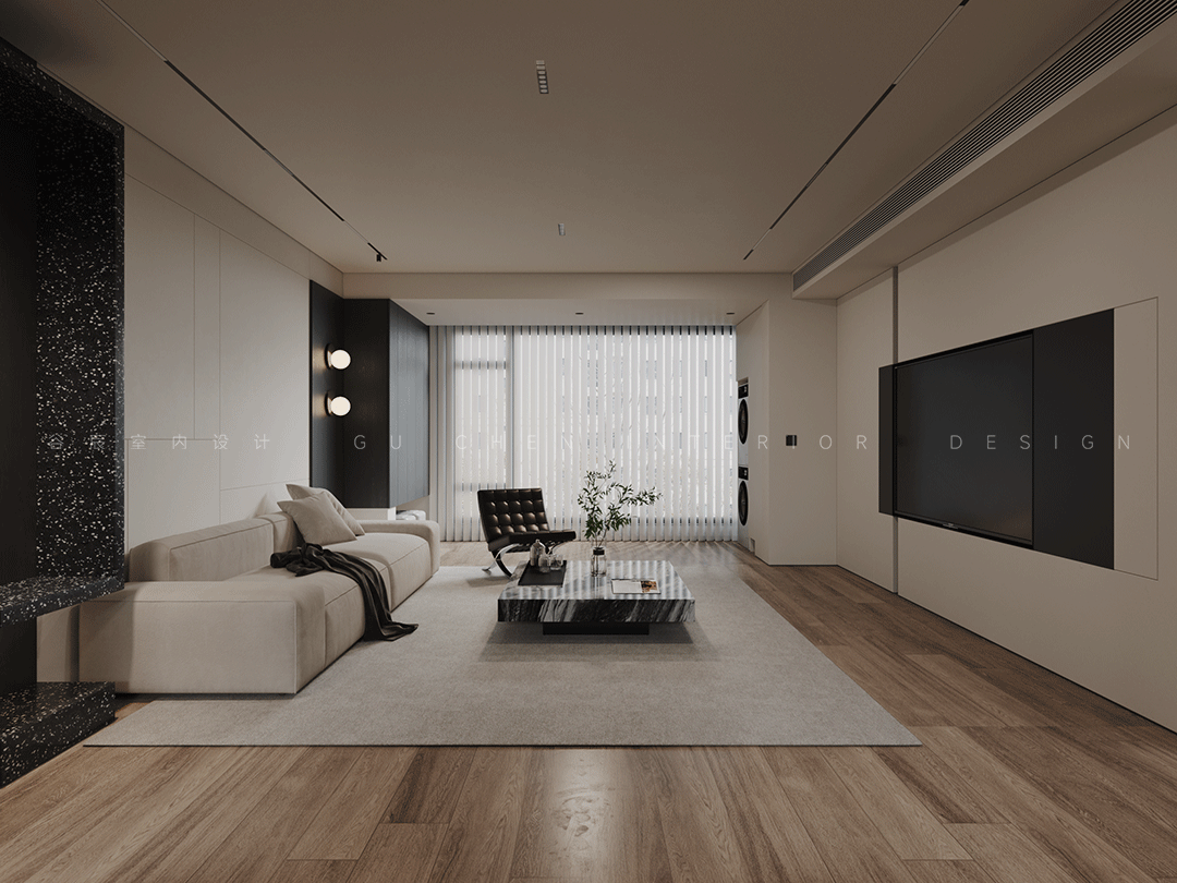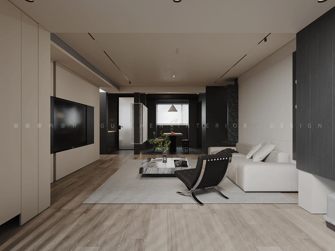 空间中黑白灰的配色奠定了理性的基调,又以低饱和度的木地板进行柔和,理性而不失温情。无主灯的设计让顶面空间视觉无限延伸,低调的奢华感呼之欲出。