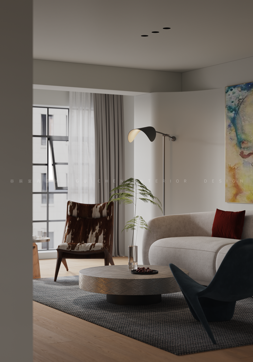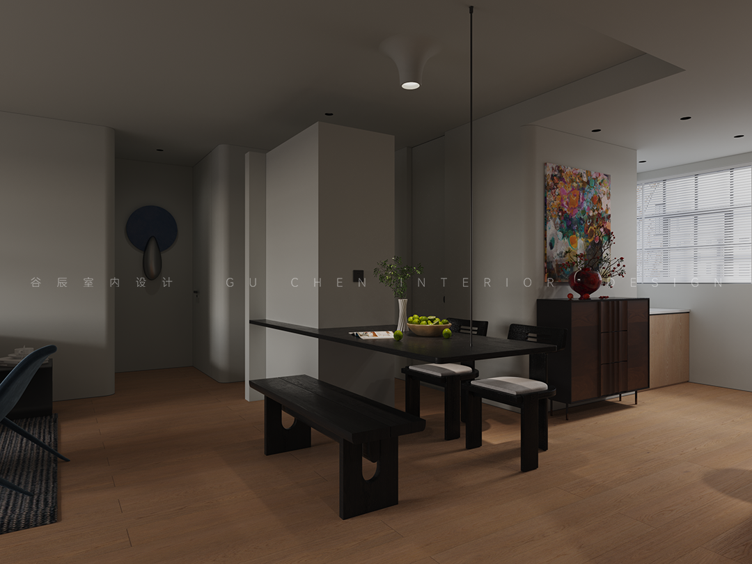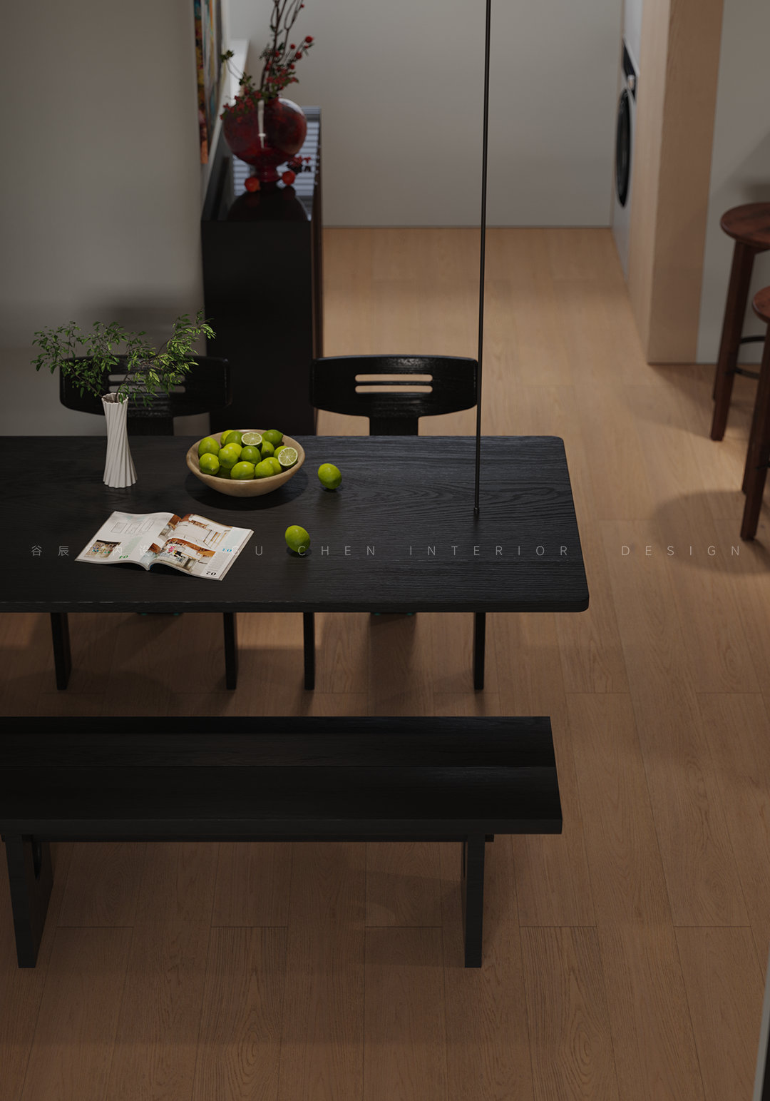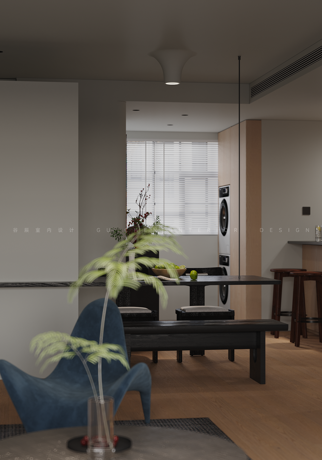本案的屋主是一位30岁的自由职业者,家是工作与生活的交融之所,她畅想着沐浴在木香与自然光影中的悠然生活,光影在屋内跳跃,斑驳而温暖。屋内有一些淡雅的色彩,如原木的自然色、淡淡的绿植,空间散发着宁静与生机,仿佛时间在这里变得悠长而悠长。