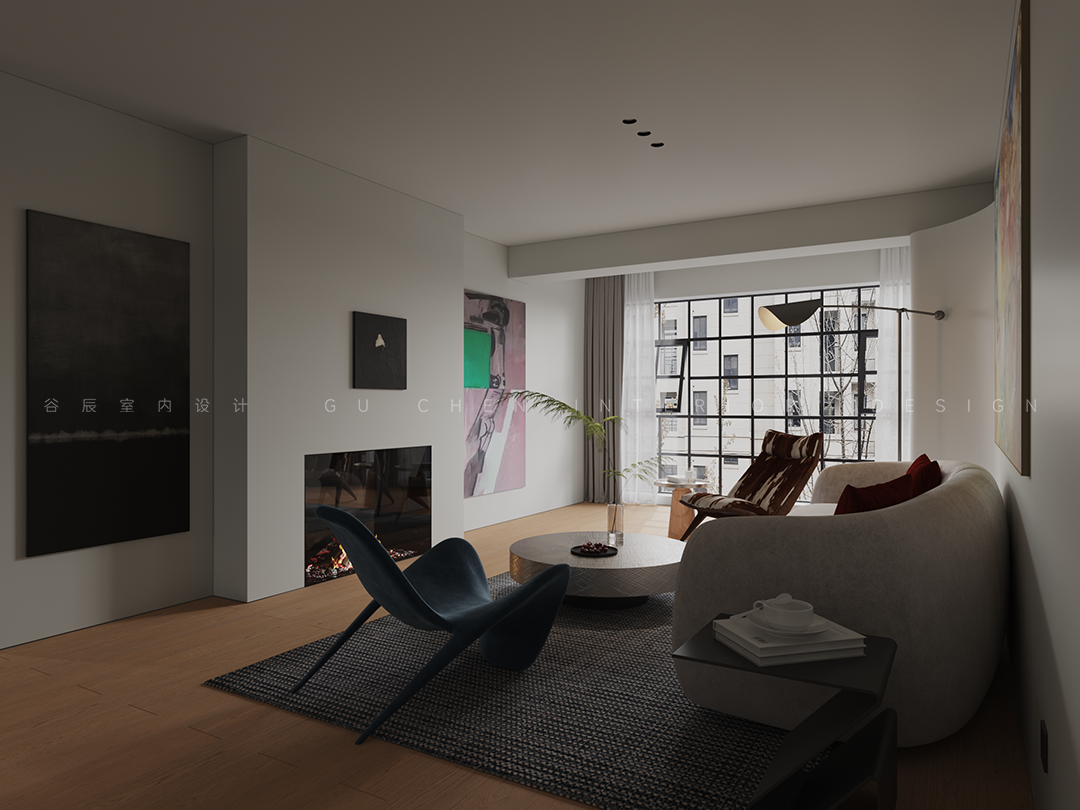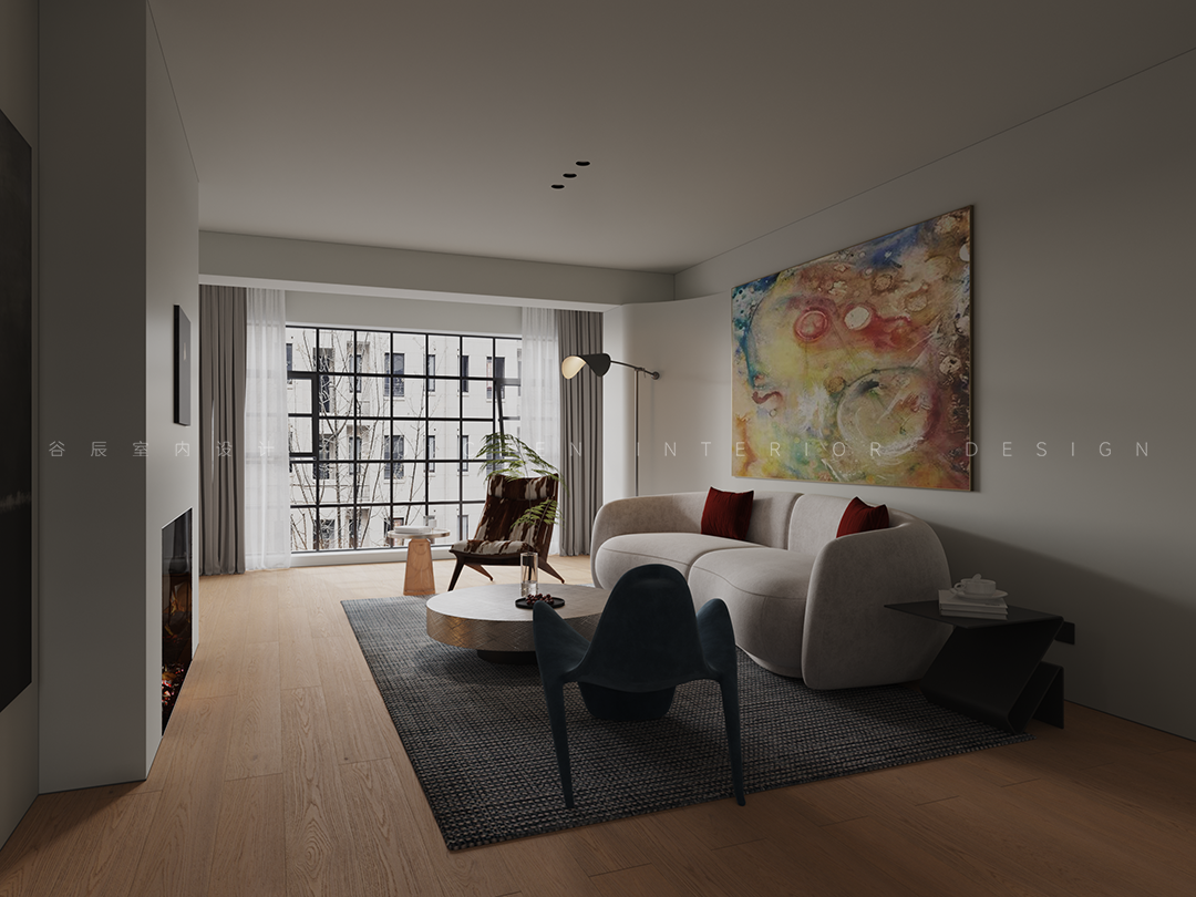 背景墙采用简约的壁炉设计,无边框装饰画搭配其中,仿佛置身久违的艺术画展,品味与艺术相得益彰。