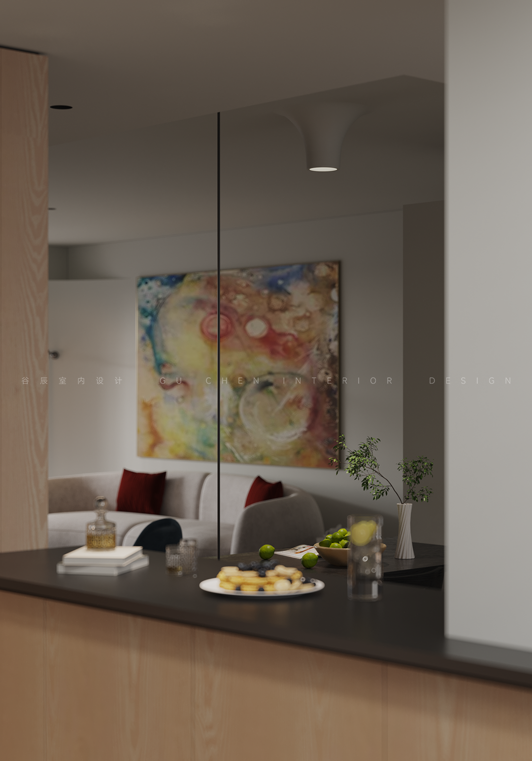 厨房与餐厅由吧台区隔开,保留了充足的空间感和采光度,也可做为岛台,随手取餐 。生活的姿态在此处尽显无疑,人生得意须尽欢.....有酒,亦有故事。