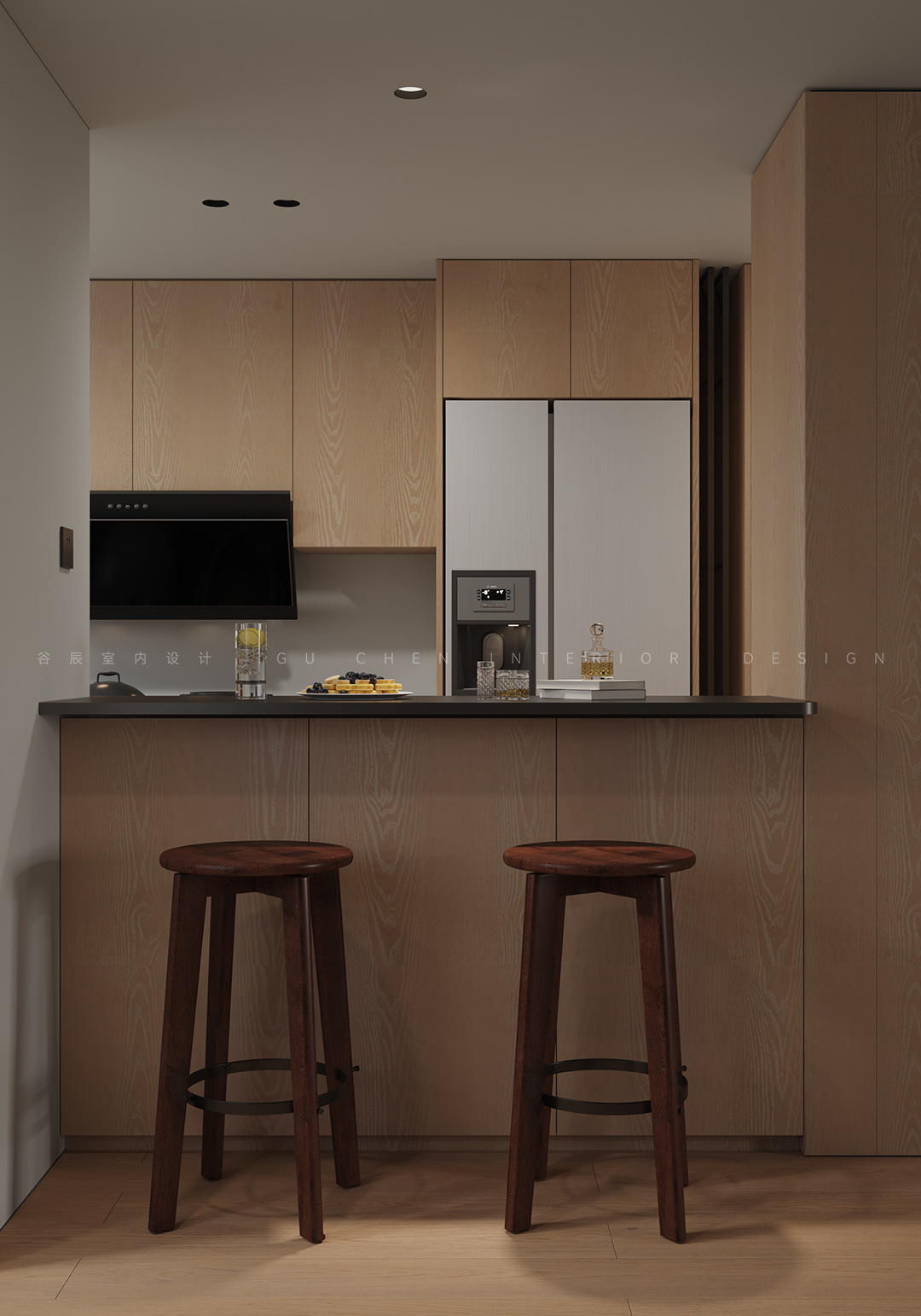 4.厨房由吧台隔开,形成半开放状态,通透有格调