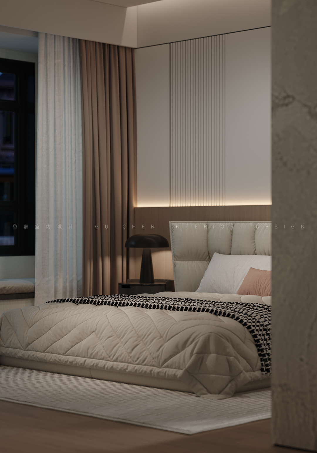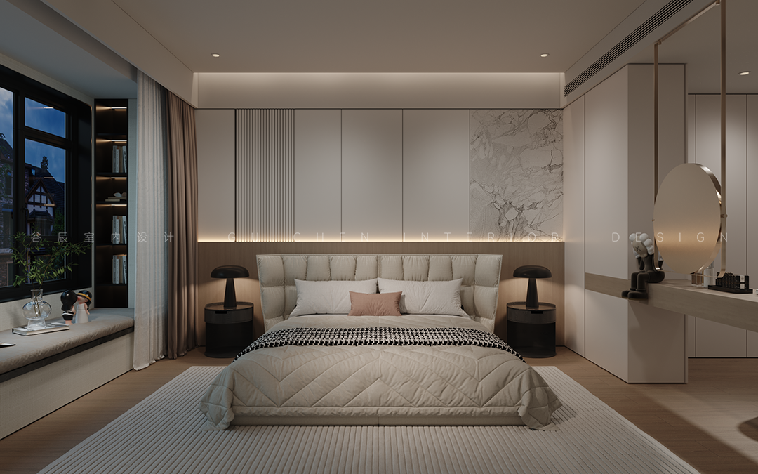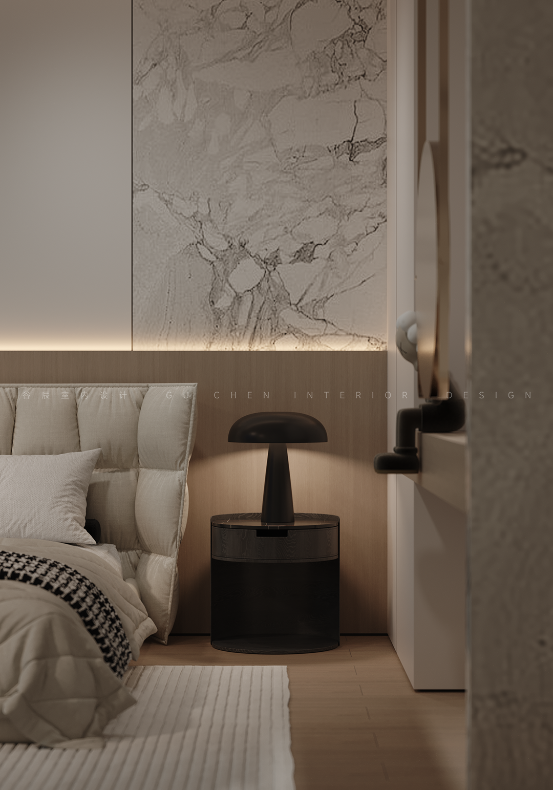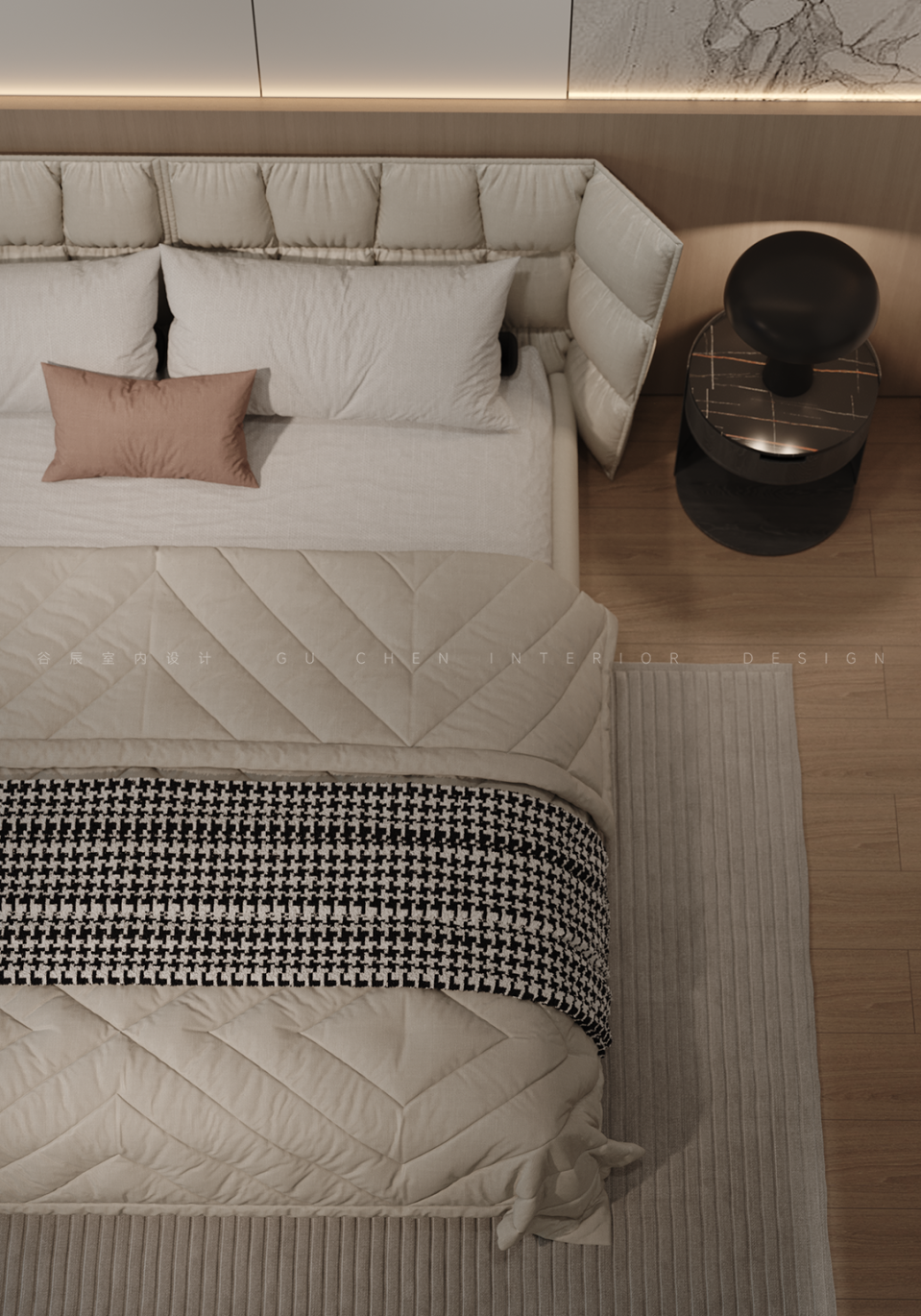 背景墙拼接了不同纹理和材质,将美观与艺术性巧妙融合,赋予空间独特的优雅高级感。内置的灯带更是注入了温馨的氛围,意式轻奢美学在此展现的淋漓尽致。