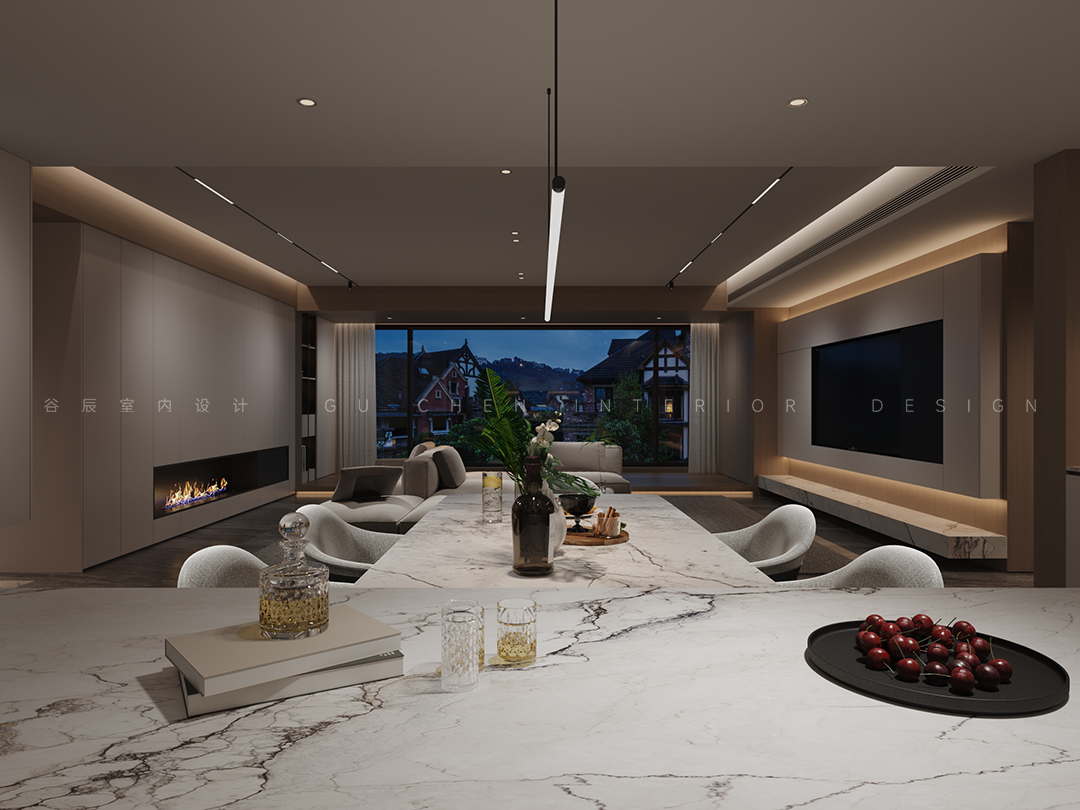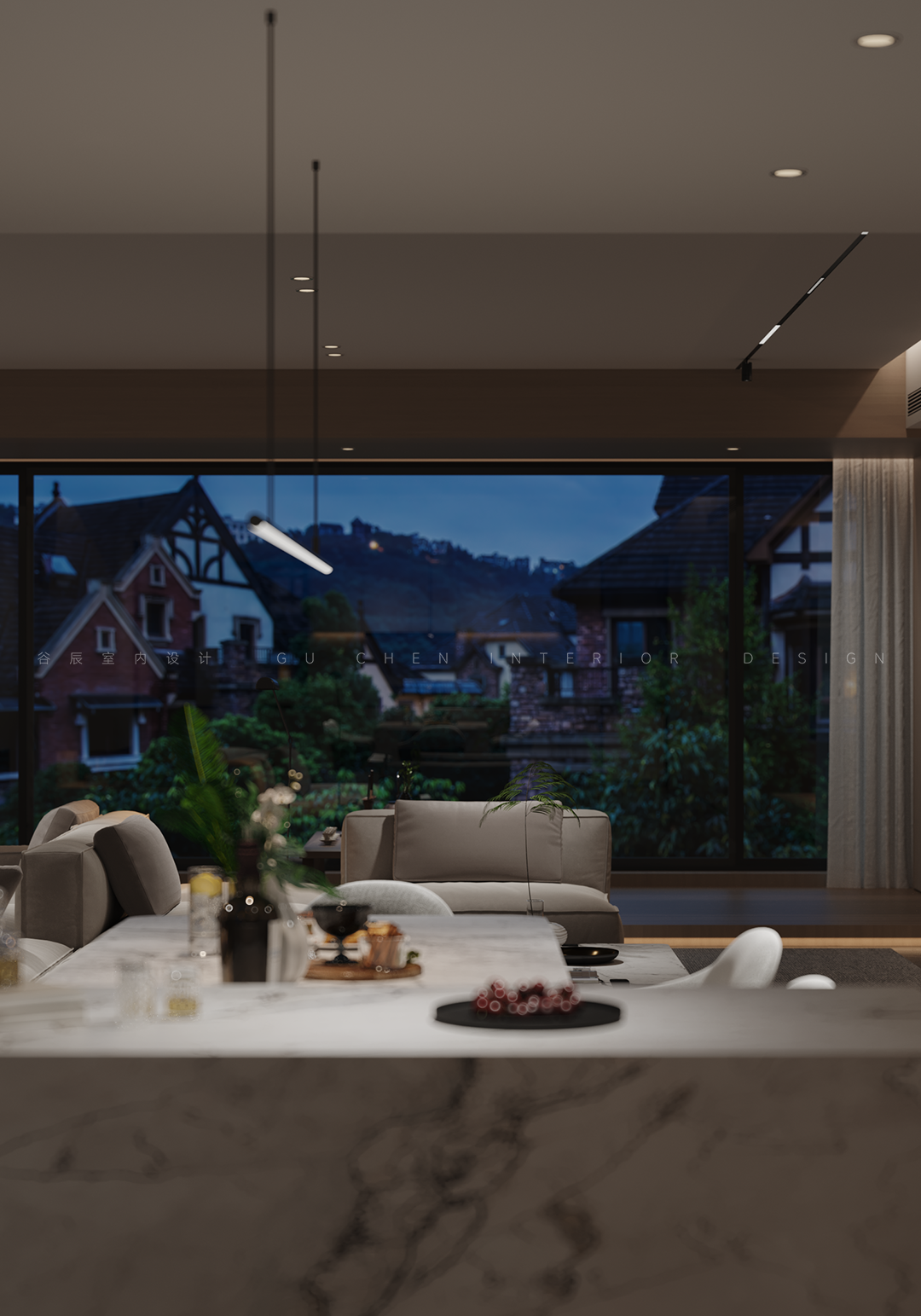 遍布美丽纹理的石材台面,散发着朴素雅致的自然质感,搭配细腻柔软的休闲座椅,温馨之中透露着一份珍贵的奢华感。顺着视线深入,大面积的落地窗模糊了室内外的界限。