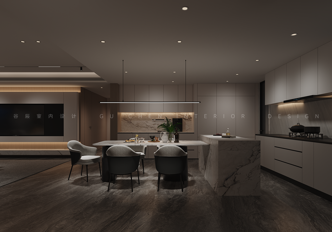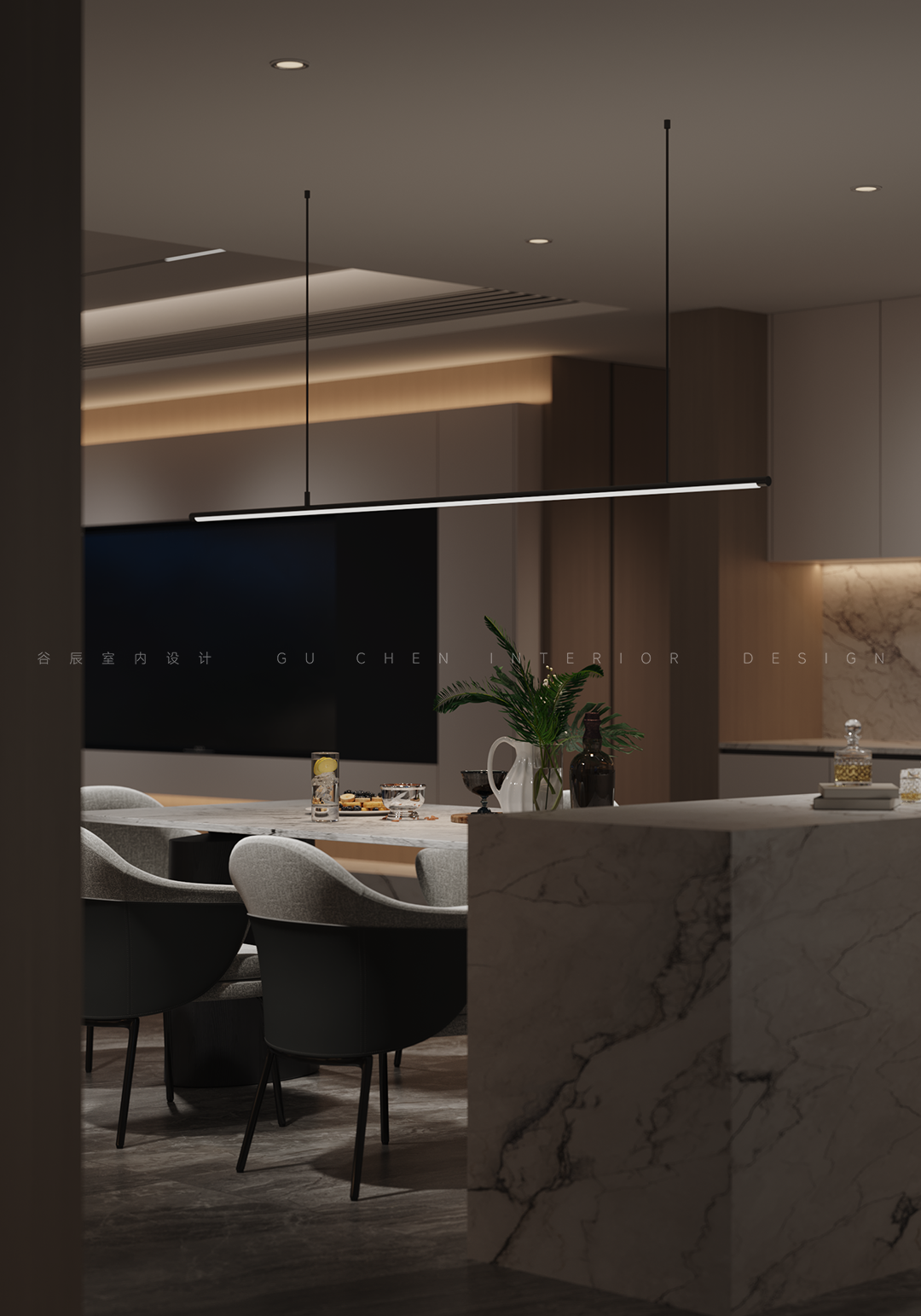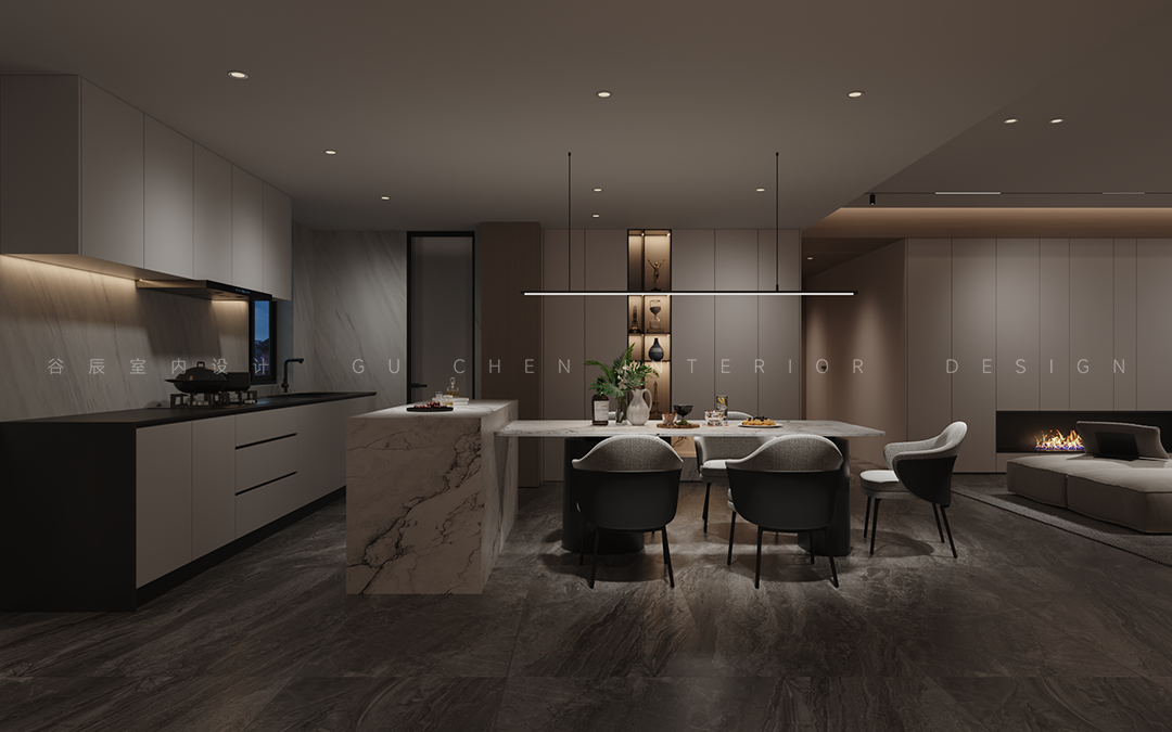 宽敞明亮的大通间布局,自然光与灯光明暗交织,仿佛整个空间都沐浴在自由自在的氛围之中。毗邻的开放式厨房通过岛台打破区隔,更进一步营造了一种轻松宜人的用餐氛围。