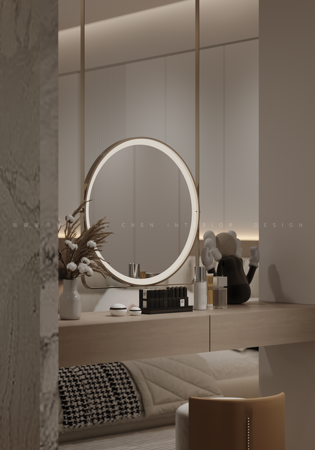 消除整墙的收纳柜,采用局部镂空设计,引入梳妆台,以此方式使整个空间更加通透明亮。