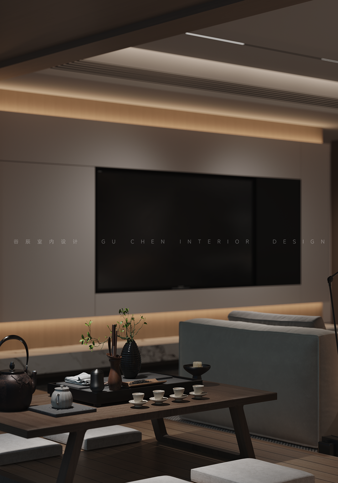 以整墙的极简白色储物柜为主体,融合简洁有力的线条,使视觉感官得以消融并延伸。底部采用巧妙的悬空设计,并搭配内嵌的灯带装饰,为空间注入了温暖的气息。