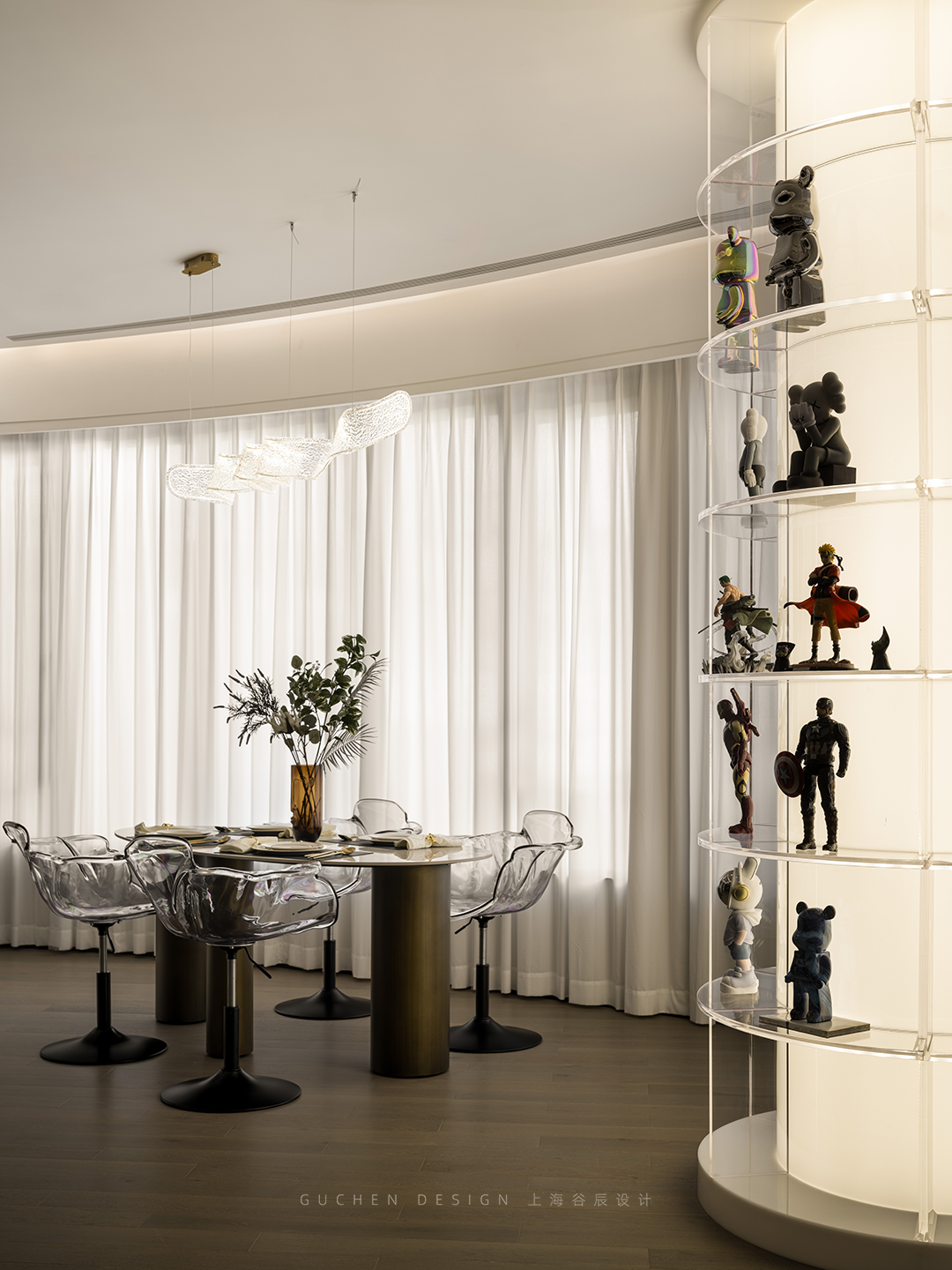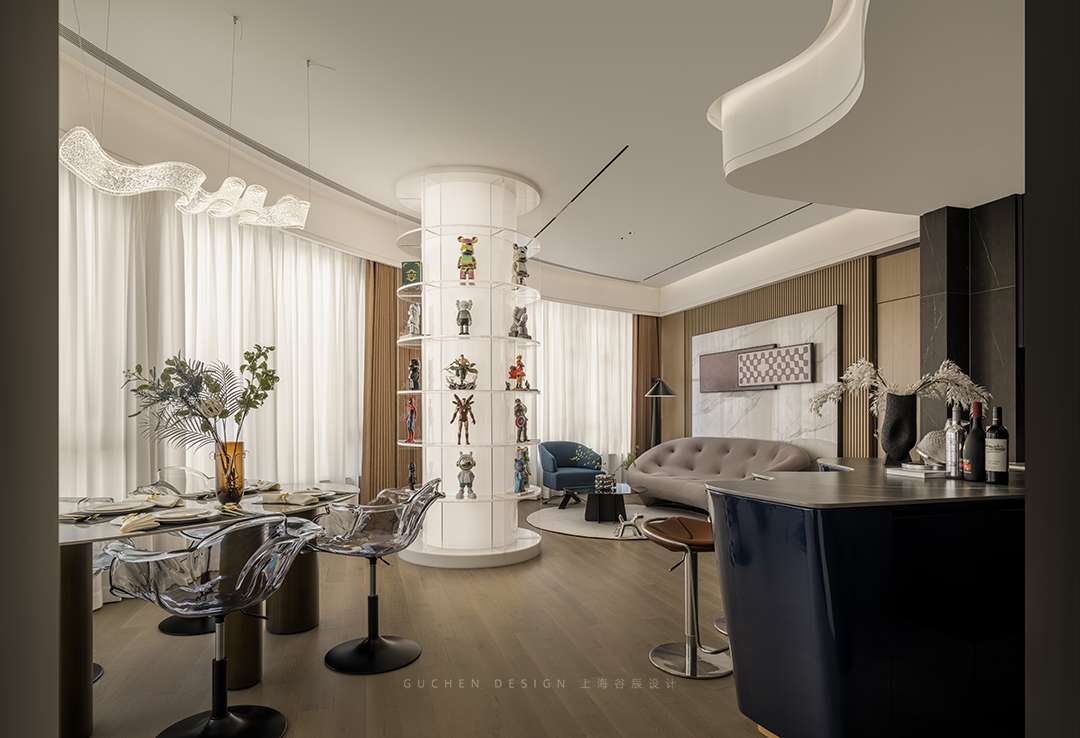 1、客厅的结构柱无法敲除,所以将它设计成发光柱,上面摆上手办,让柱子融入空间