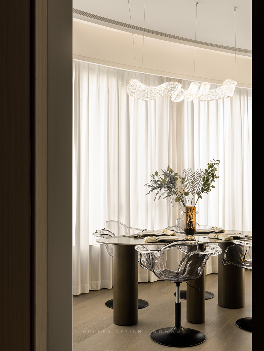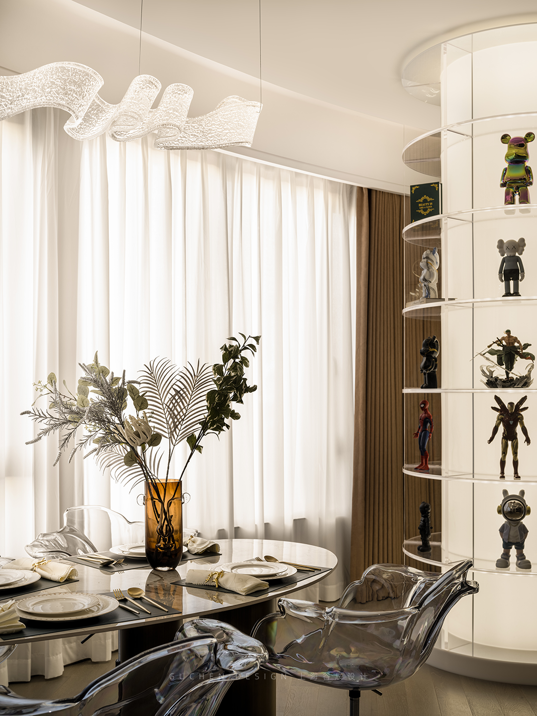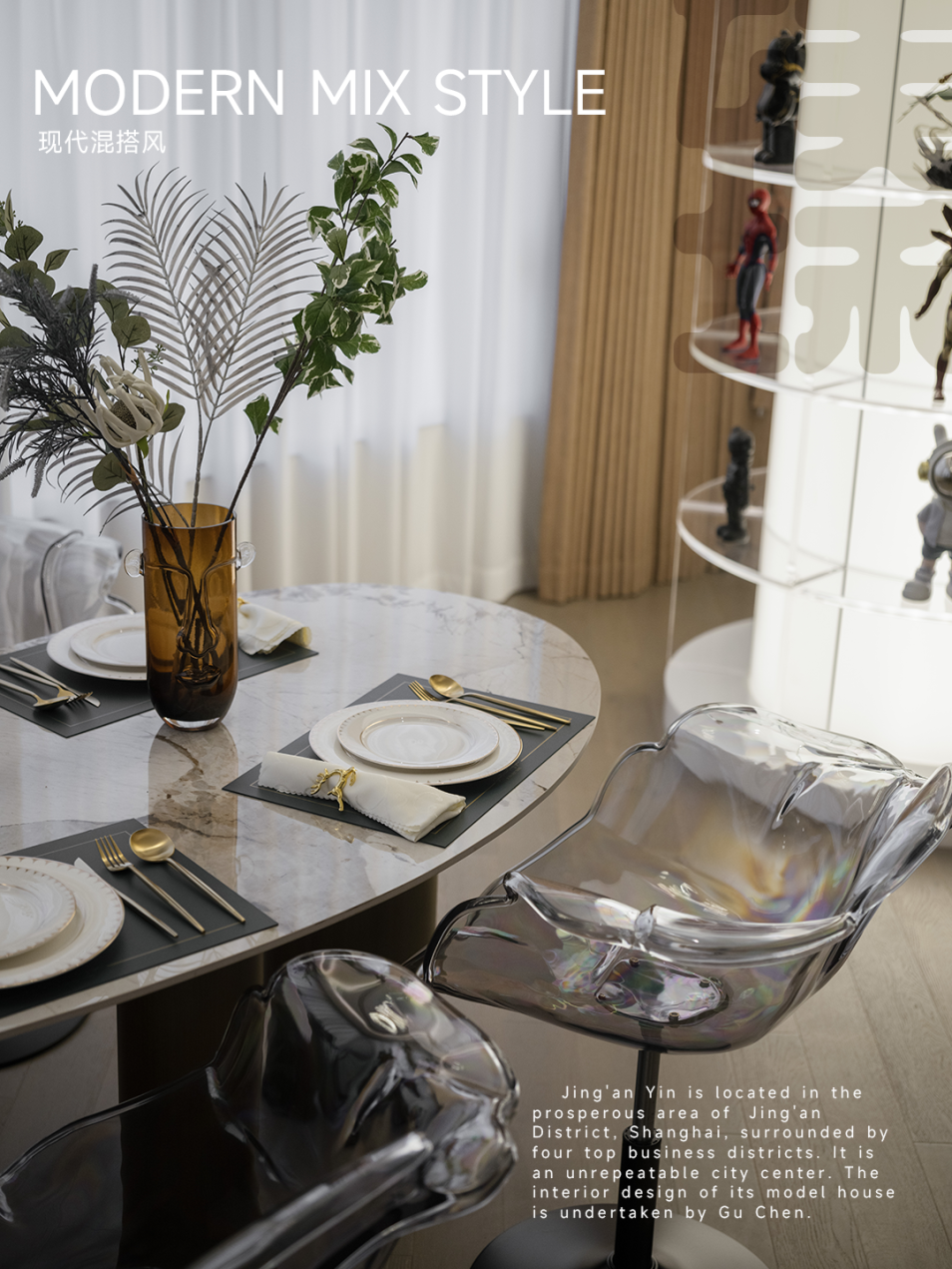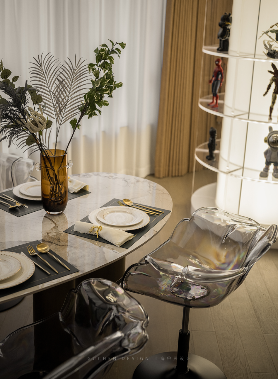石材纹餐桌、亚克力透明餐椅、金属餐具……不同材质的碰撞间,妙趣横生。
