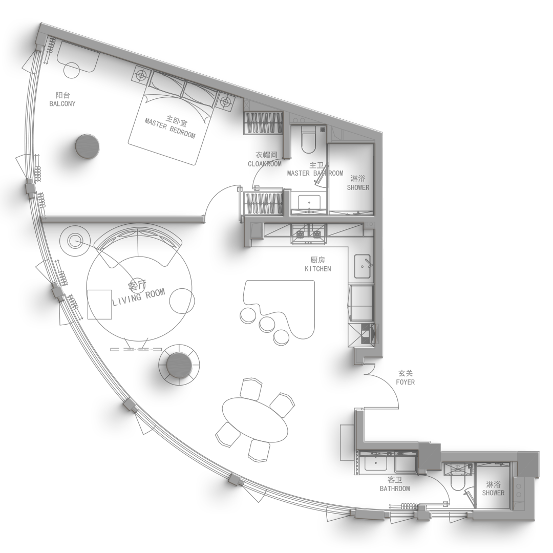 Use color matching to create a sense of spatial hierarchy. Use gray and white as the theme color to create a high-end atmosphere.