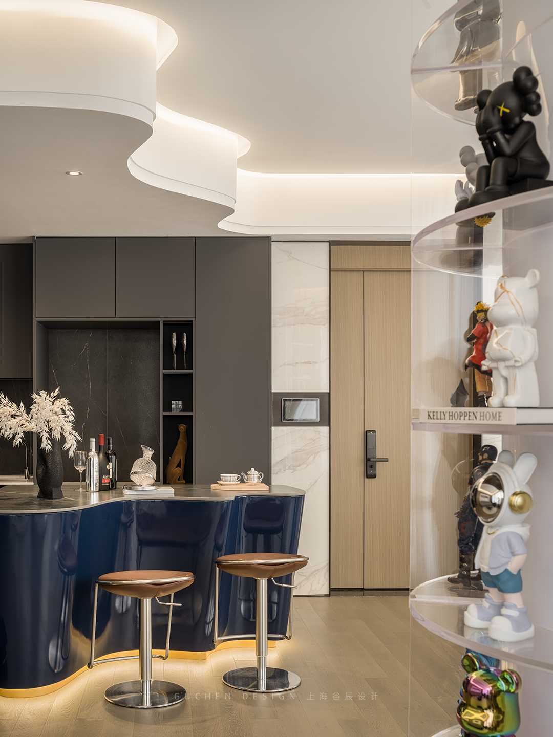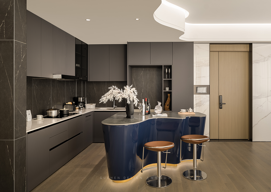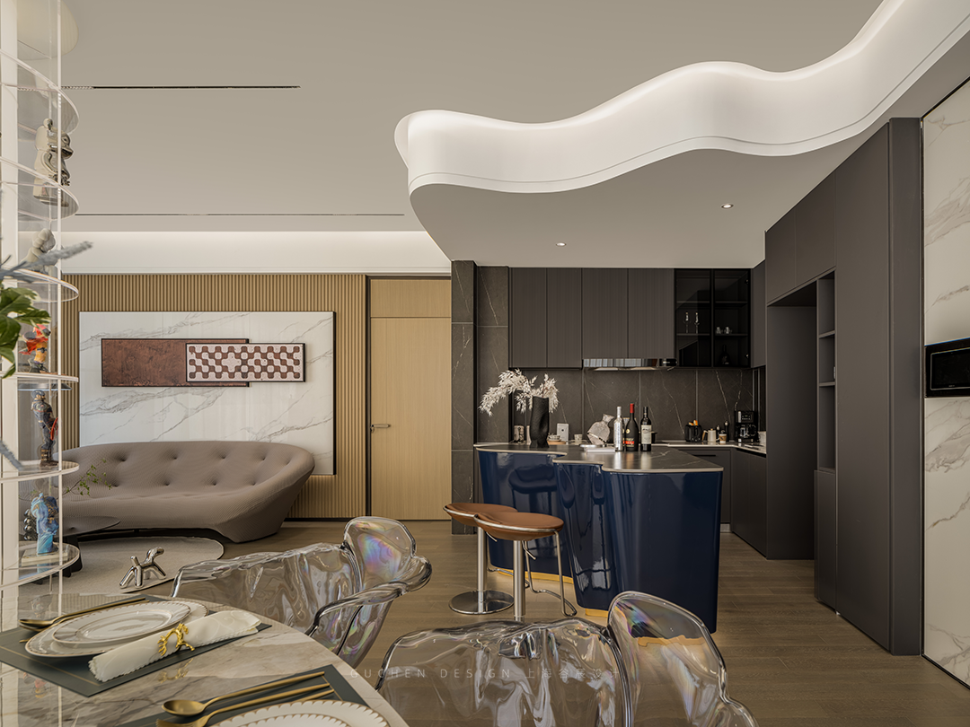 An open kitchen is built to break the space constraints and get rid of lonely cooking. The wave-shaped island counter echoes the flowing water-shaped ceiling above.