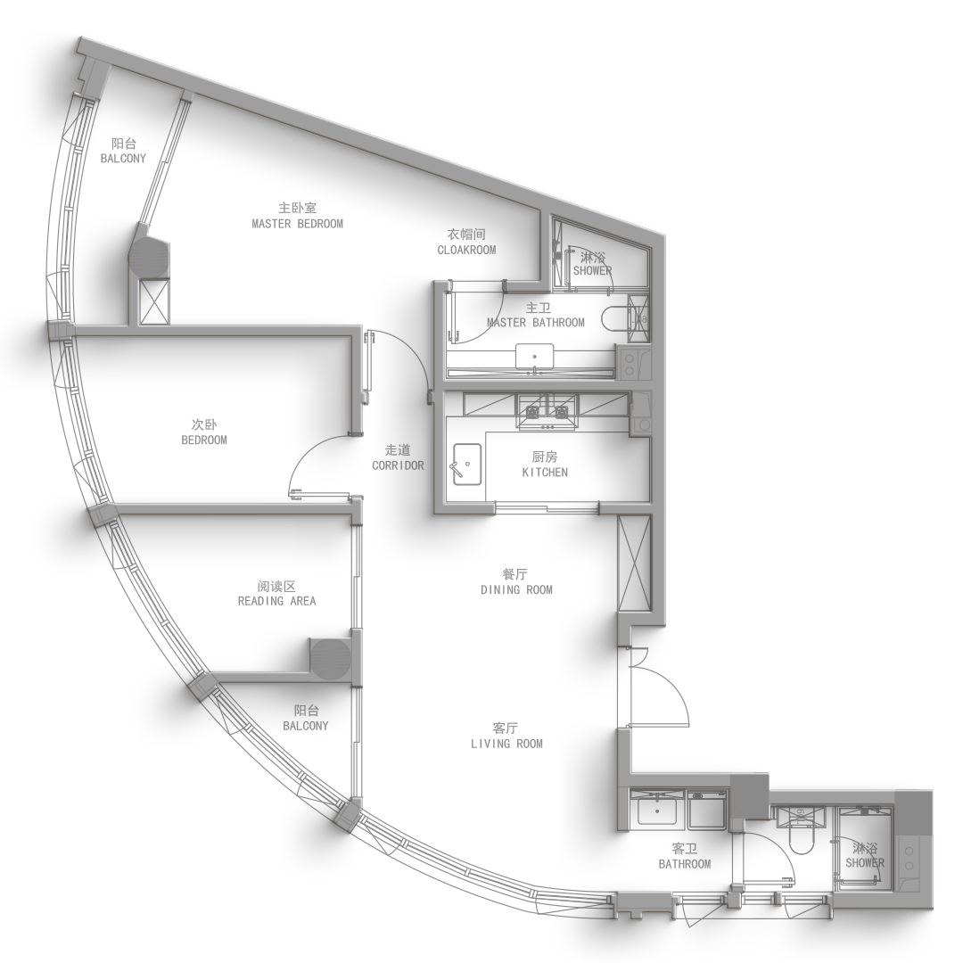本案中设计师从建筑经典中提炼“拱”形之美,以现代之笔重塑,拆除所有能拆的非承重墙,将次卧、阅读区的小空间与客厅打通,打造全新开放式格局,让局促的空间更显大气。用心处理的色彩与材质,为居住者提供了一个充满艺术气息和生活情调的家。