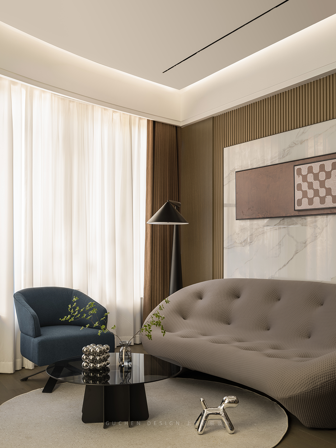The living room is a perfect combination of hard lines and curved elements. The combination of hardness and softness creates a unique modern style living room.