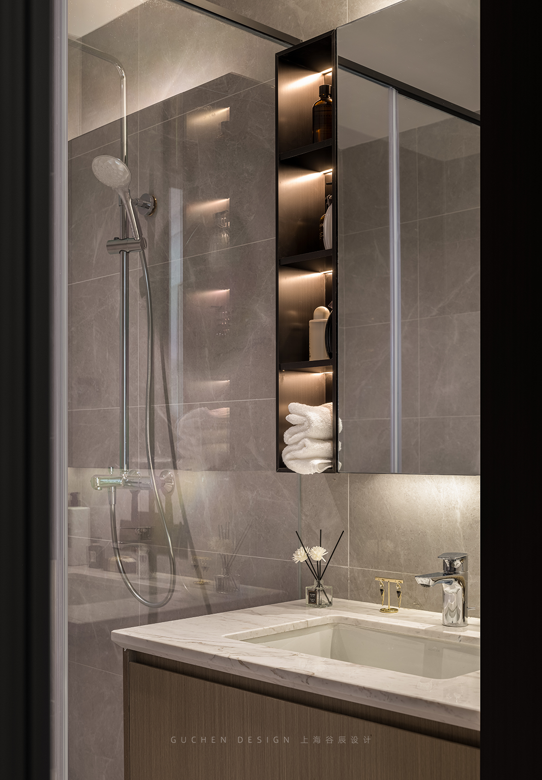 靠近淋浴区一侧增设收纳柜的设计真的很棒,加上灯带,也很有氛围感。
